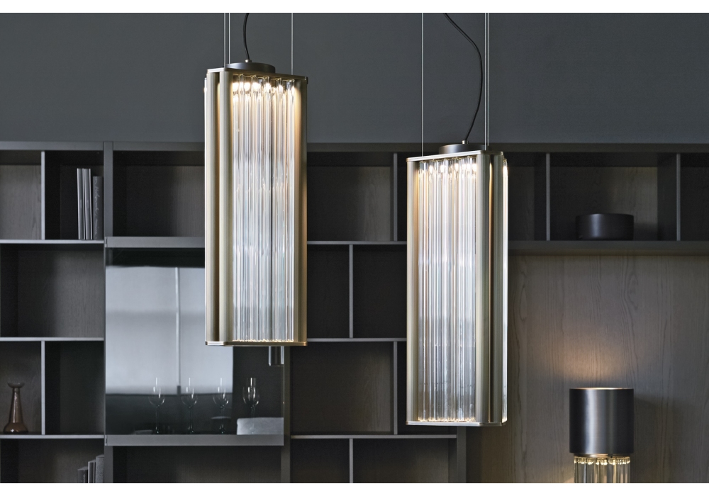 Numa, von Massimo Tonetto für Venicem entworfen, ist eine Hängeleuchte, die diffuses Licht spendet. Struktur aus dunkel brüniertem Messing. Triedri aus Kristallglas, bernsteinfarbenem oder rauchgeblasenem Muranoglas. Dimmer-Kit separat erhältlich.