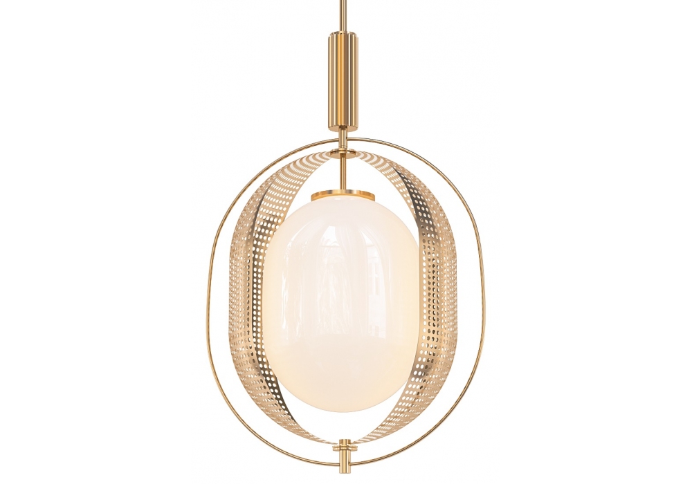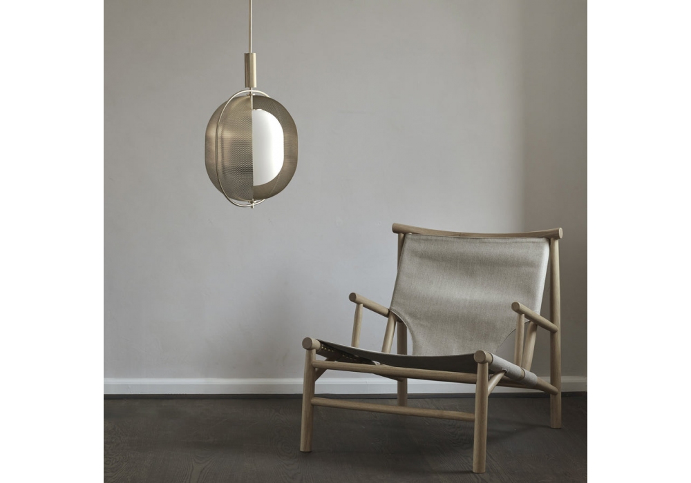 Pearl von Kristian Sofus Hansen & Tommy Hyldahl für 101 Copenhagen entworfen, ist eine Pendelleuchte aus vermessingtem Metall und Diffusor aus Opalglas.