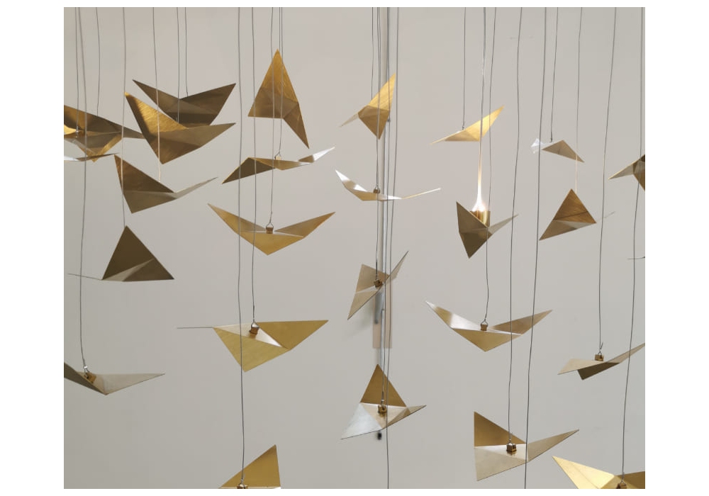 Etourneaux XL von Ombre Portée entworfen, ist eine Hängeleuchte aus gebürstetem und gewachstem Messing. Box driver aus lackiertem Holz.
