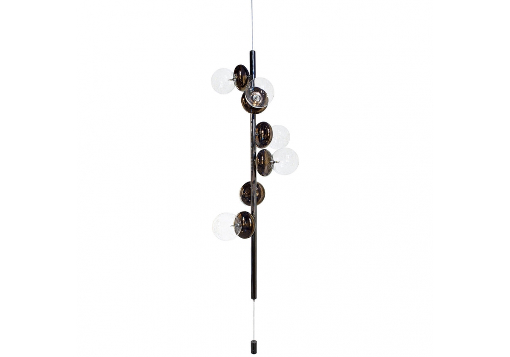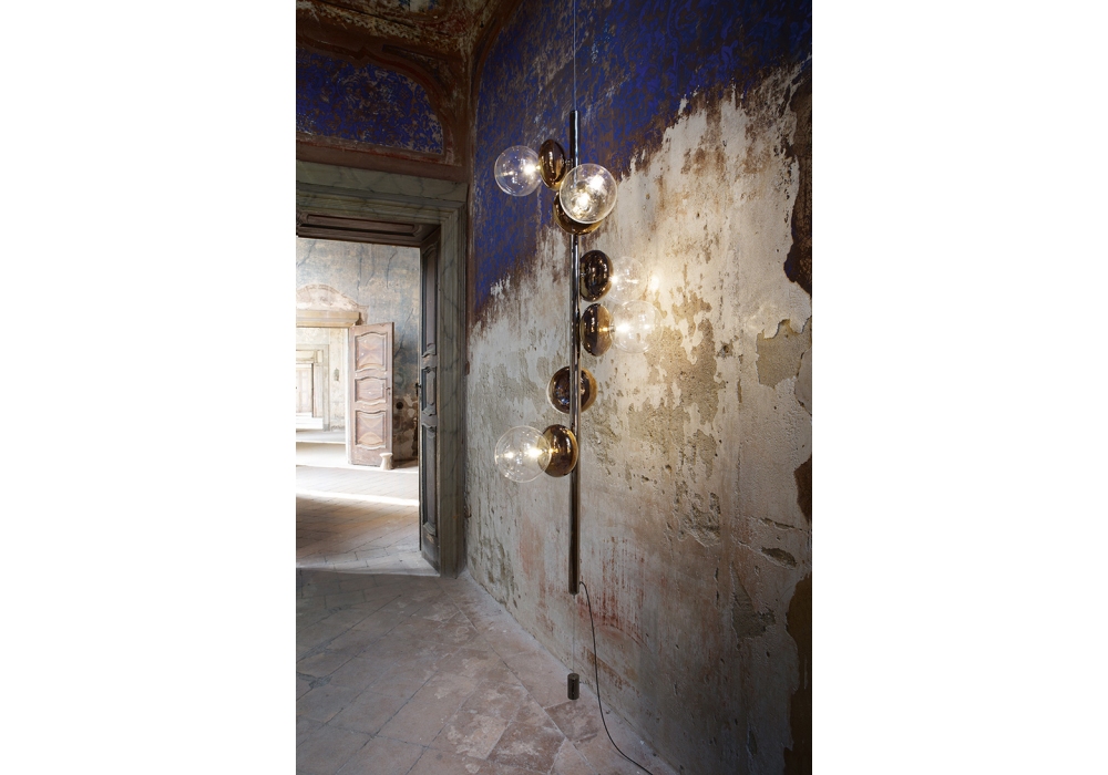 Unica, entworfen und hergestellt von Fisionarte Studio, ist eine hängende Stehlampe mit einer tragenden Struktur aus schwarz verchromtem Metallrohr. Die Diffusoren sind kugelförmig aus transparentem Pyrexglas und elliptisch in Bronzefarbe, vereint in einem einzigen Körper. Als Lichtquelle wird ein LED-Anschluss vom Typ G4 verwendet.