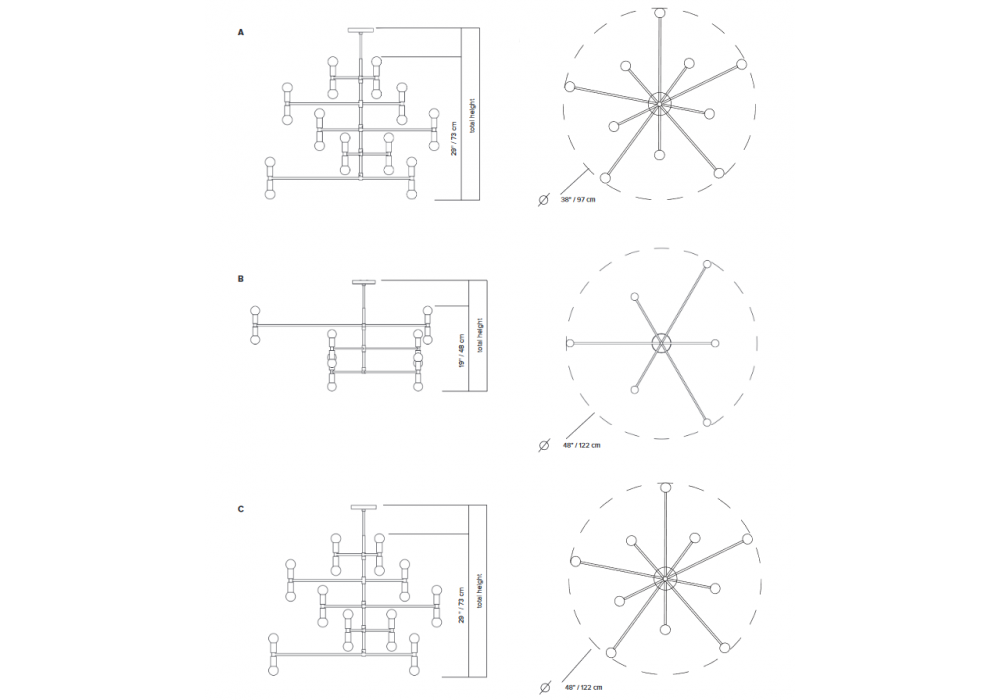 | Abmessungen | Model A: ⌀ 96.5 x H 72.7 cm; Model B: ⌀ 121.9 x H 47.9 cm; Model C: ⌀ 121.9 x H 72.7 cm. |