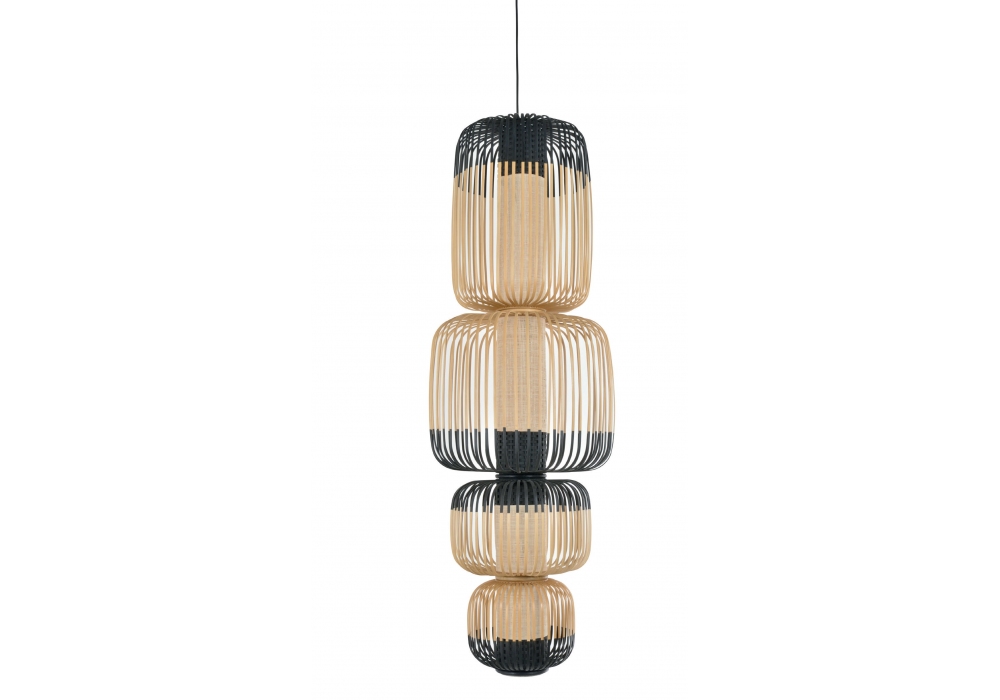Bamboo 4 Lights von Arik Levy für Forestier entworfen, ist eine Hängeleuchte, die sich durch vier runde Strukturen aus Bambus und Textilkabel auszeichnet. Verfügbar in schwarz oder weiß.
