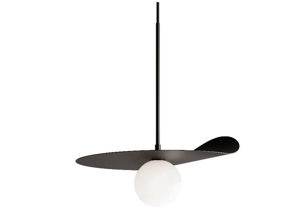 Flow von Chris Basias für Kundalini entworfen, ist eine Hängeleuchte mit Diffusor aus geblasenem Opalglas und Struktur aus schwarz lackiertem Metall.