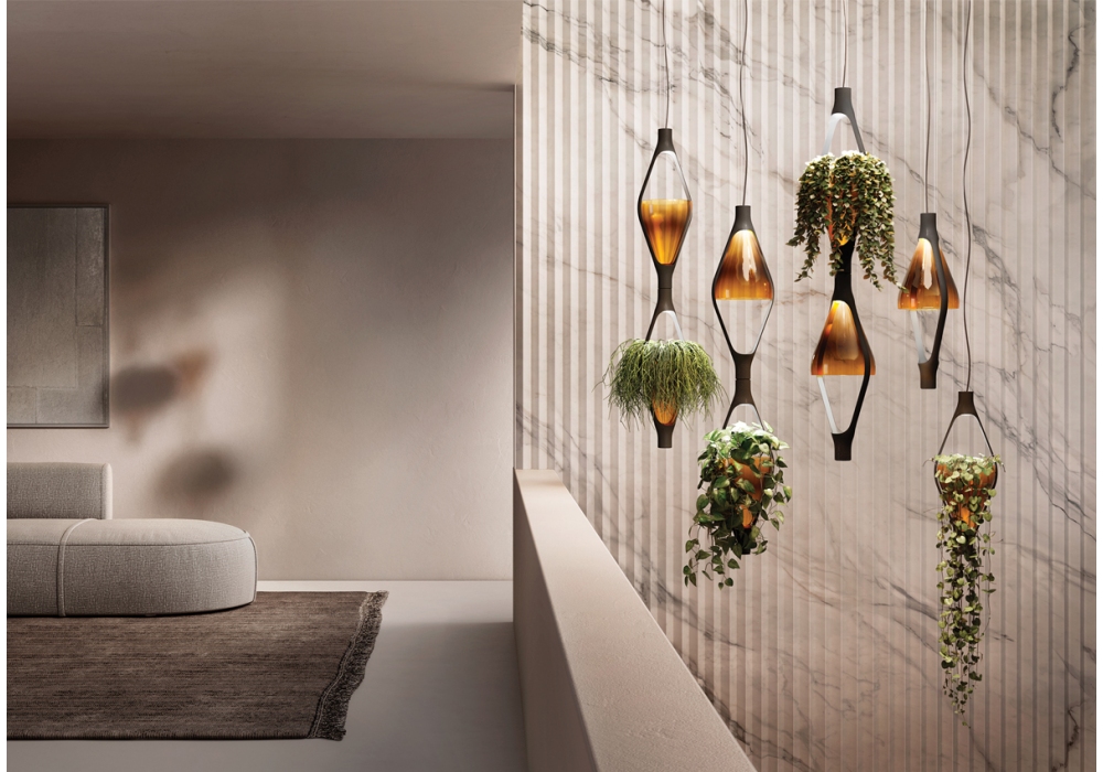 Viceversa von Noé Duchaufour Lawrance für Kundalini entworfen, ist eine Hängeleuchte mit Diffusor aus mundgeblasenem Glas und Struktur aus lackiertem Metall. Eine einfache Drehung und die Lampe kann Pflanzenelemente aufnehmen. Verfügbar in verschiedenen Abmessungen und Ausführungen.