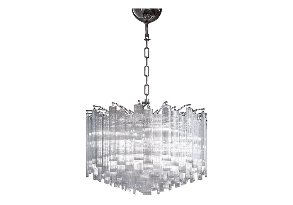 Nastri, entworfen und hergestellt von Venini, ist eine Pendelleuchte, die aus mundgeblasenen Glaselementen besteht. Die Metallteile sind verchromt.