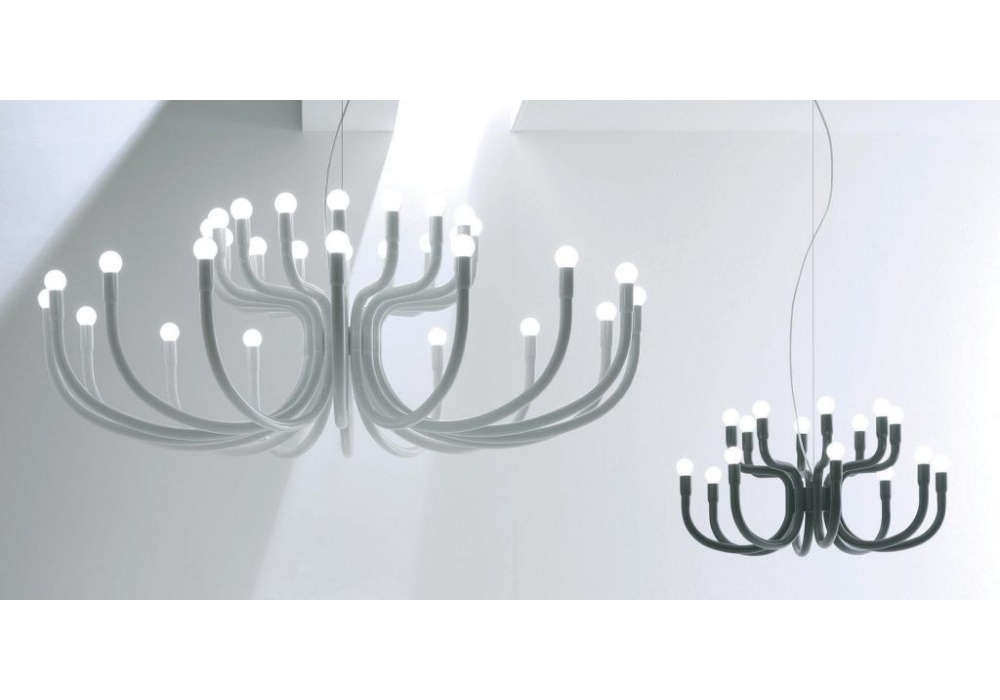 Snoob, von Matteo Ugolini für Karman entworfen, ist eine Pendelleuchte mit Struktur aus schwarzem oder weißem Aluminium und Deckenrosette aus Metall in der gleichen Ausführung. Erhältlich in verschiedenen Größen. Interne Benutzung. Glühbirne nicht enthalten.