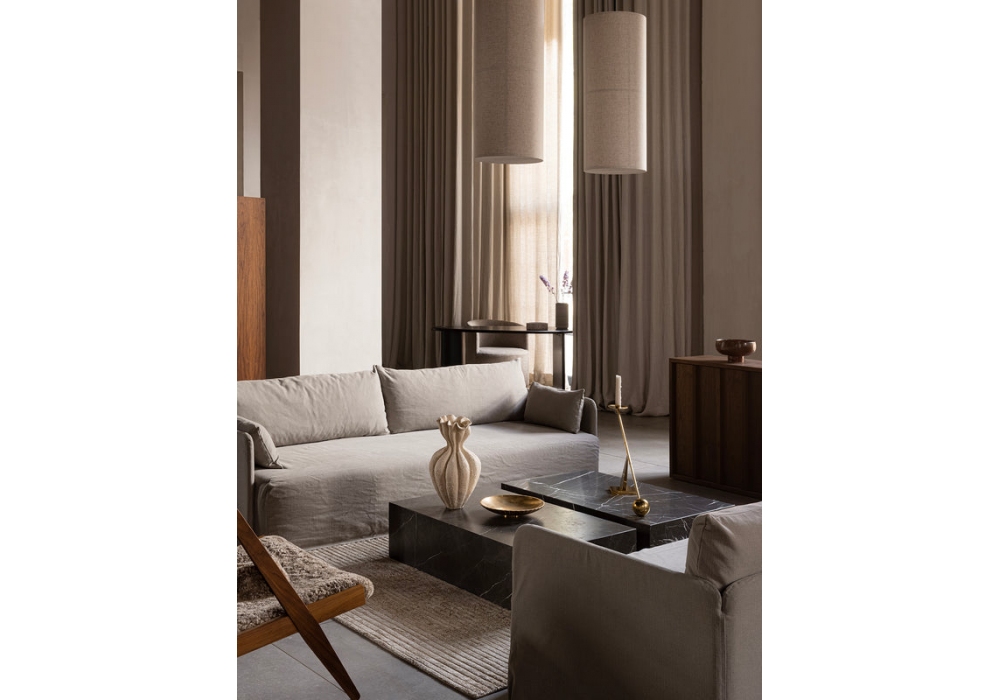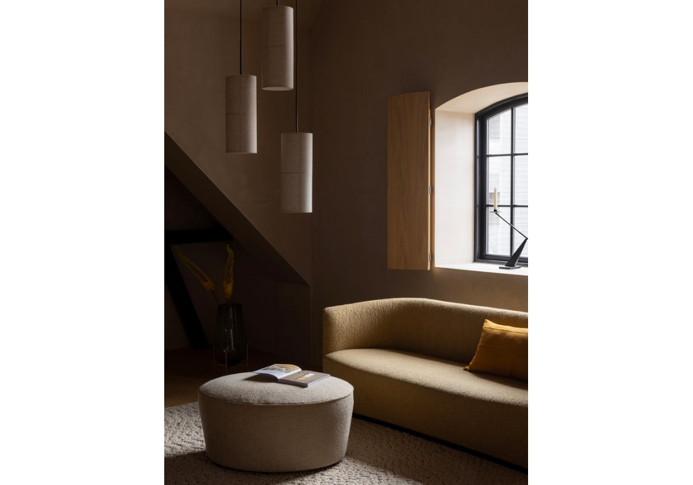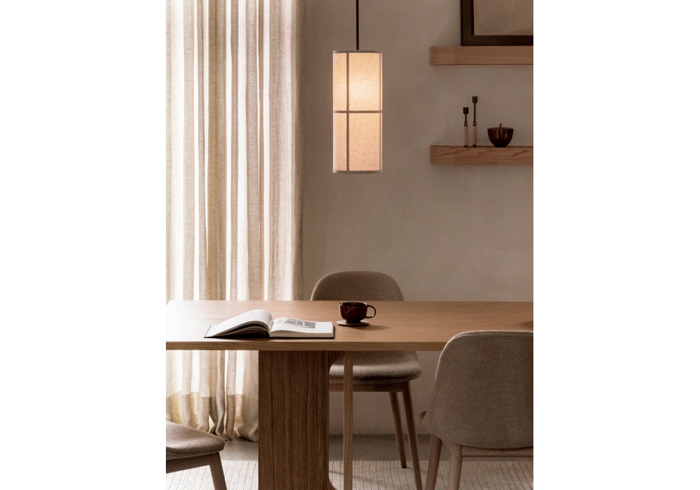 Hashira von Norm Architects für Menu entworfen, ist eine Pendelleuchte mit zylindrischer Form, Aluminiumstruktur und durchscheinendem Lampenschirm aus Stoff. Erhältlich in verschiedenen Ausführungen und Größen.