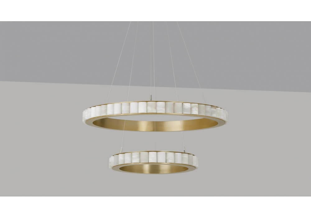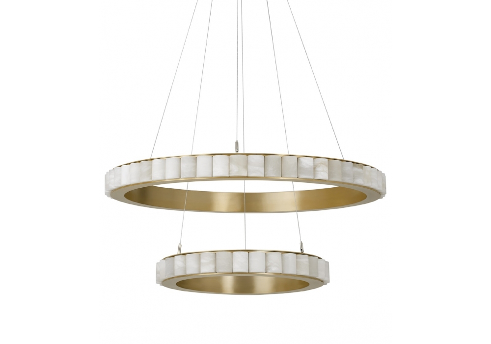 Avalon Halo von CTO Lighting entworfen, ist eine LED-Hängeleuchte aus Bronze oder satiniertem Messing, Details aus Alabaster. Edelstahlkabel.