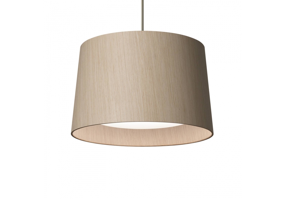 Twiggy Wood, von Marc Sadler für Foscarini entworfen, ist eine runde Hängeleuchte mit Lampenschirm aus gebleichter Eiche und Verbundmaterial auf einer Glasfaserbasis. Der Diffusor ist aus PMMA und Polycarbonat strukturiert und schirmt eine LED-Lichtquelle in verschiedenen Versionen ab.