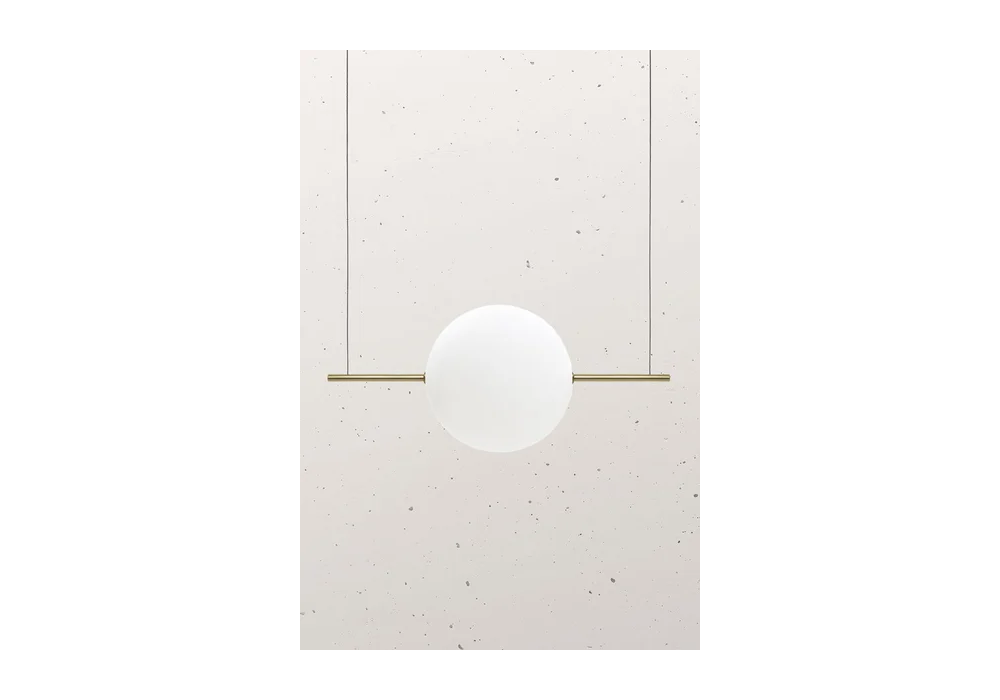 Alma entworfen von Matteo Cibic Studio für Il Fanale ist eine Hängeleuchte mit horizontaler röhrenförmiger Messingstruktur. Der Diffusor ist kugelförmig aus Opalglas gefertigt und schirmt eine dimmbare LED-Lichtquelle ab.
