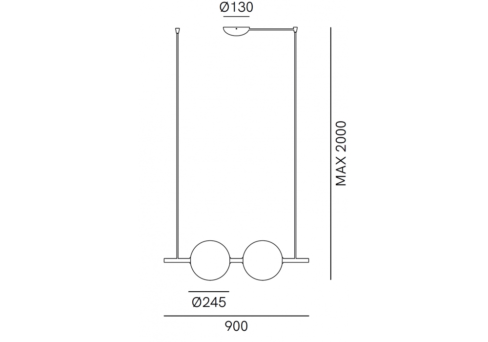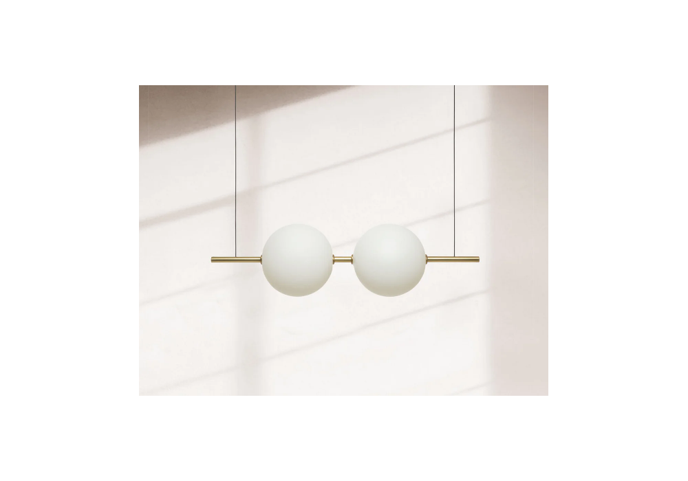 Alma Two entworfen von Matteo Cibic Studio für Il Fanale ist eine Hängeleuchte mit horizontaler röhrenförmiger Messingstruktur. Die Diffusoren sind kugelförmig und aus Opalglas gefertigt und schirmen die dimmbaren LED-Lichtquellen ab.
