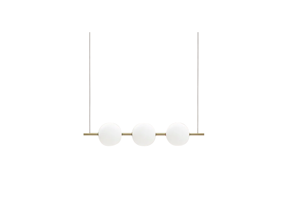 Alma Three entworfen von Matteo Cibic Studio für Il Fanale ist eine Hängeleuchte mit horizontaler röhrenförmiger Messingstruktur. Die Diffusoren sind kugelförmig und aus Opalglas gefertigt und schirmen die dimmbaren LED-Lichtquellen ab.