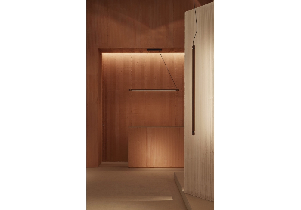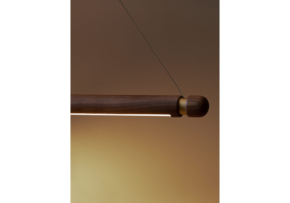 Linea H von Andrés Martínez für Nomon entworfen, ist eine Pendelleuchte mit Struktur aus Walnussholz, mit Details aus poliertem Messing oder Metall mit Graphit-Finish.
