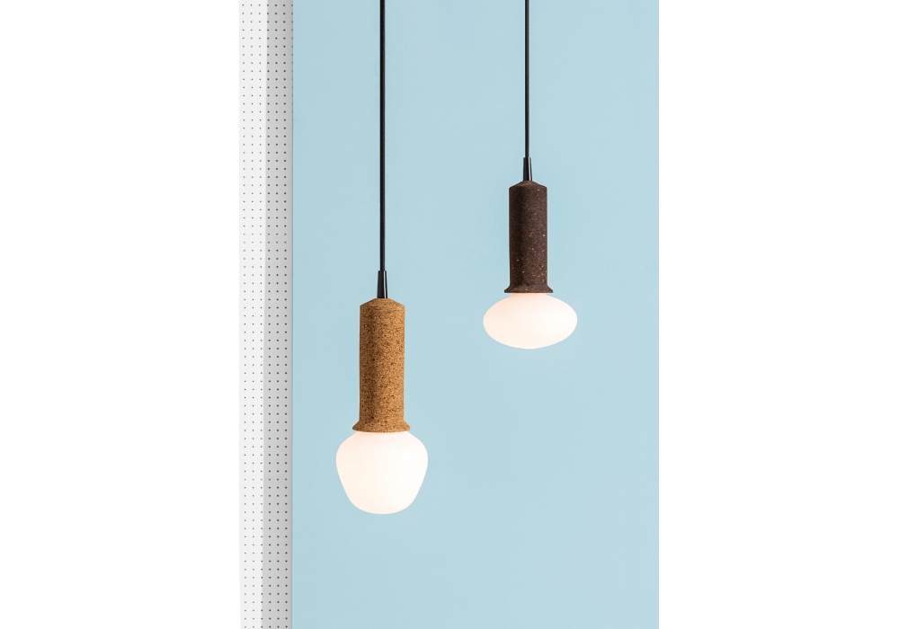 Korlux von Discipline Lab entworfen, ist eine Pendelleuchte mit Struktur aus natürlichem oder schwarzem Kork.