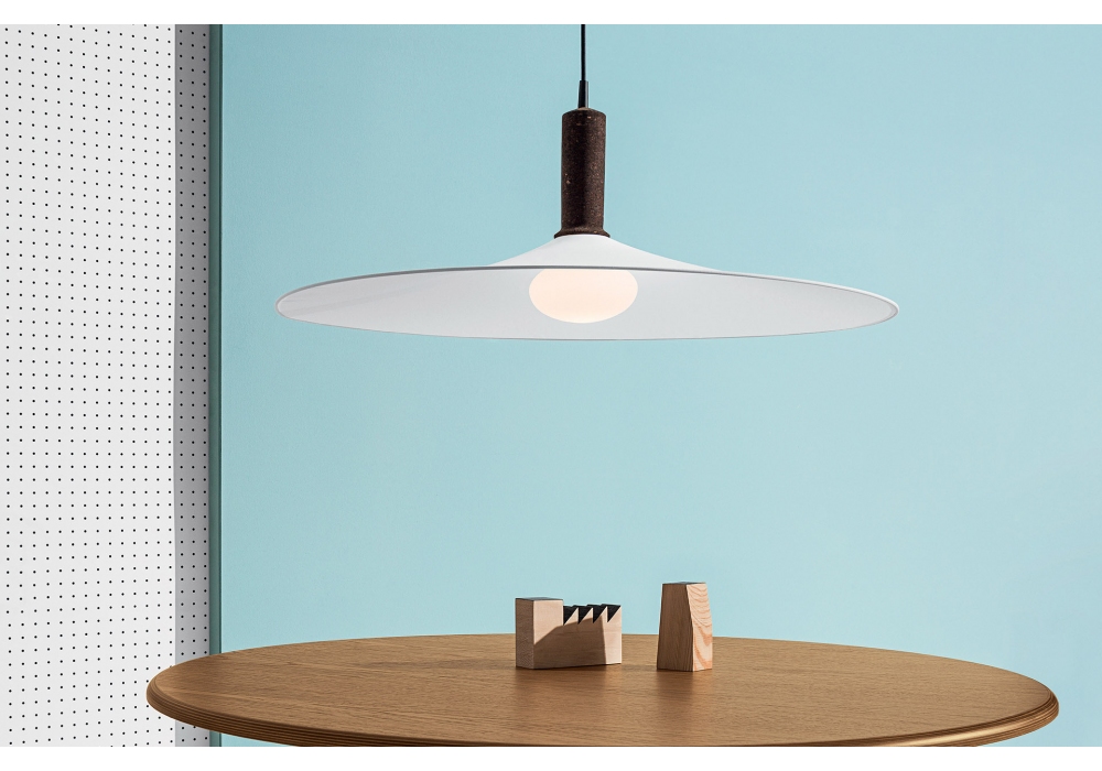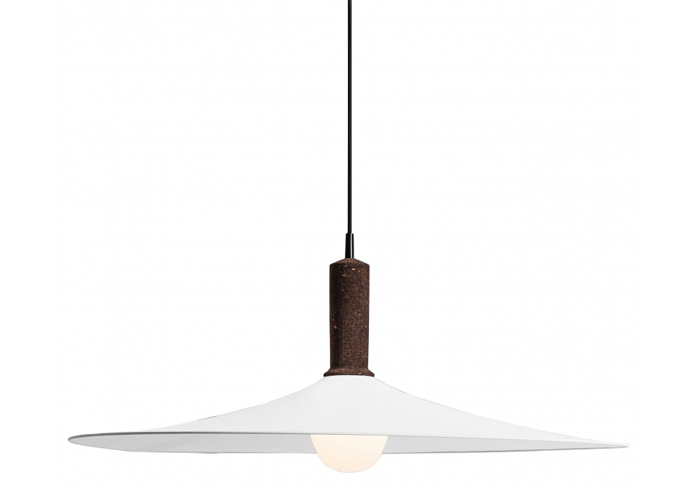 Korlux Lycra Cone, entworfen von Discipline Lab, ist eine Pendelleuchte mit Struktur aus natürlichem oder schwarzem Kork und Diffusor aus elastischem Polyestergewebe (Lycra).