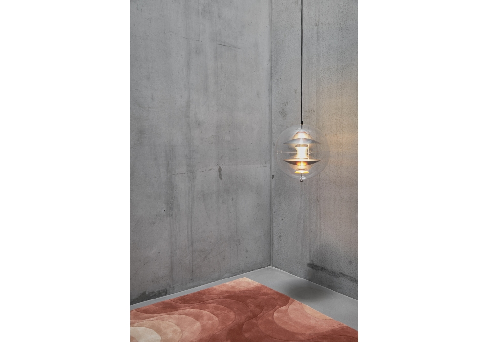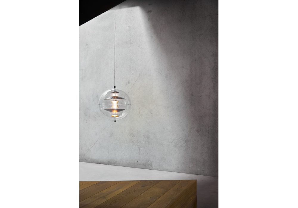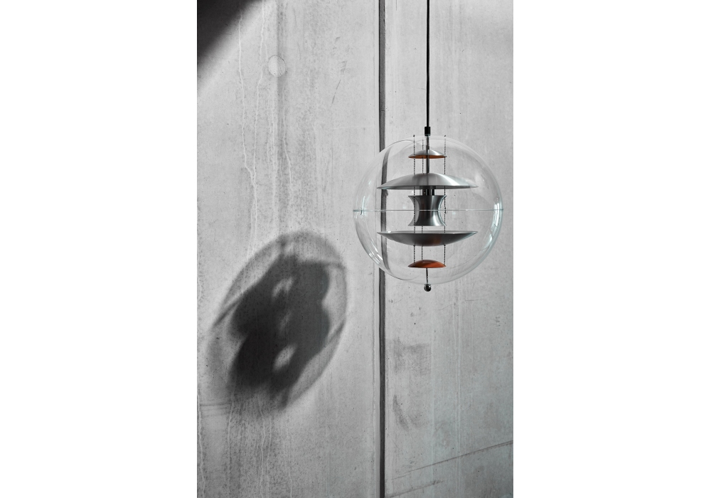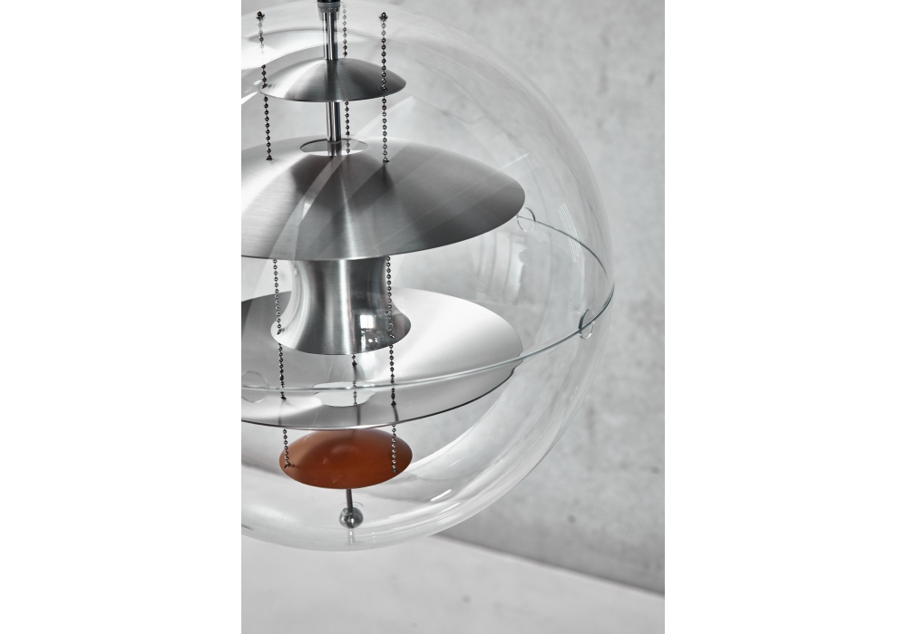 Vp Globe Brushed Alu von Verner Panton für Verpan entworfen, ist eine Hängeleuchte mit Außenkugel aus kristallinem transparentem Acryl. Im Inneren befinden sich Reflektoren in gebürstetem und gebranntem Orange, die an drei Stahlketten aufgehängt sind. Rosette in verchromter Ausführung und Aufhängungskabel in schwarzem Stoff.