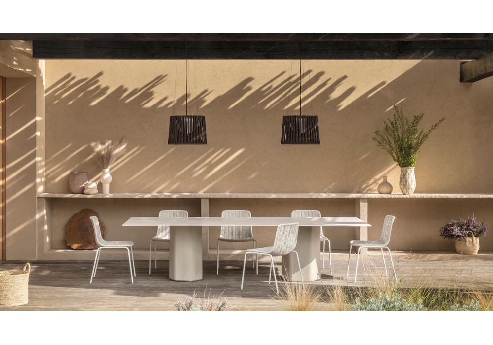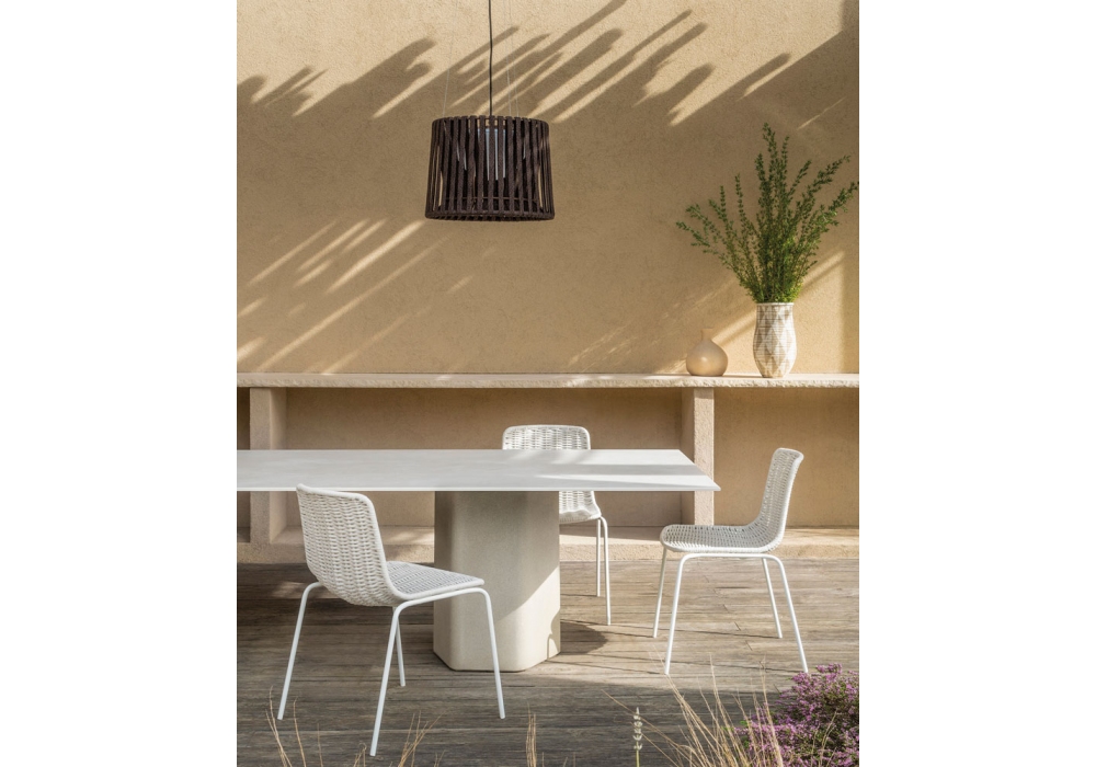 Oh Lamp, von Studio expormim für Expormim entworfen, ist eine Hängeleuchte für den Außenbereich mit einer Struktur, die mit Polyester-Pulverfarbe und einem hochbeständigen gewebten Seil veredelt ist. LED-Lichtquelle. Erhältlich in verschiedenen Ausführungen und in zwei Größen.