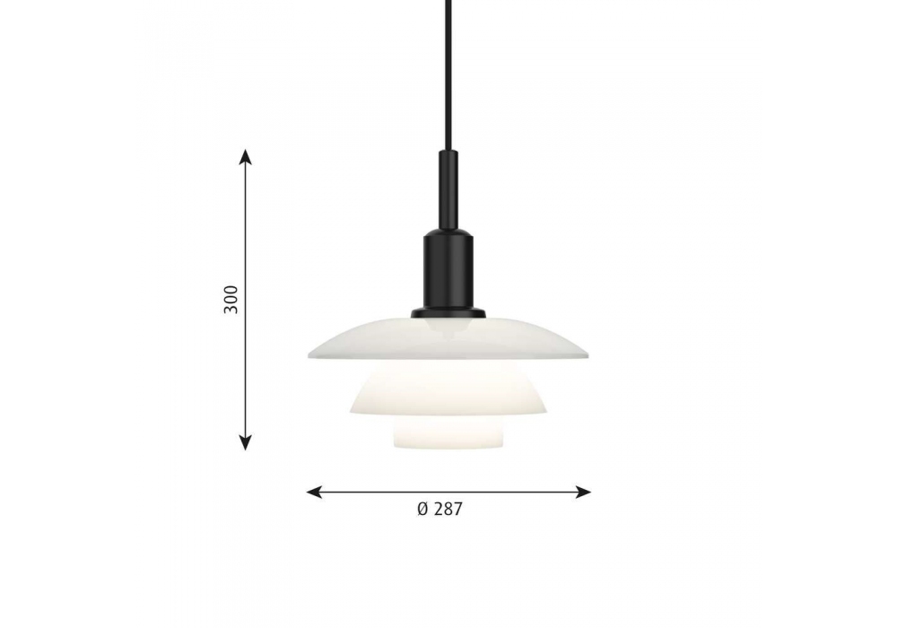 PH 3/3 von Poul Henningsen für Louis Poulsen entworfen, ist eine Hängeleuchte mit Struktur aus schwarz gefärbtem, gesponnenem Aluminium. Die kreisförmigen reflektierenden Schirme sind aus mundgeblasenem Opalglas strukturiert und filtern eine LED- oder Halogenlichtquelle mit E27-Fassung, die von einem schwarzen Textilfaserkabel gespeist wird.