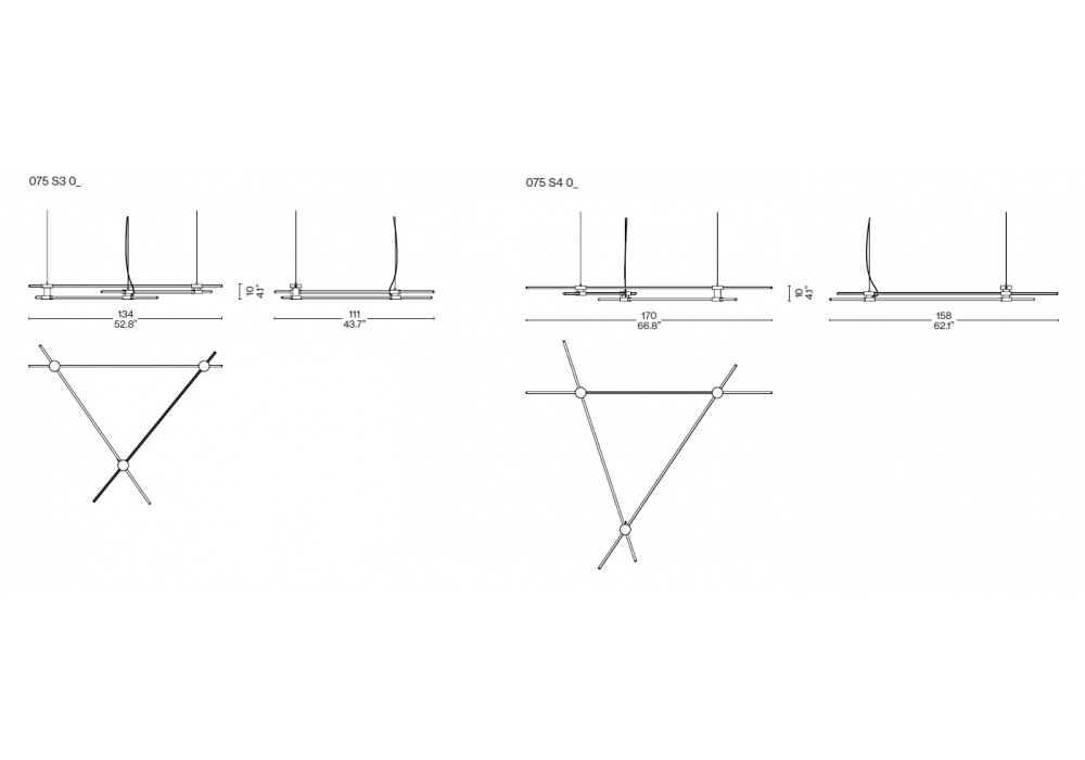 EITIE Triangle Horizontal von Tobia Scarpa für Cassina entworfen, ist eine Hängeleuchte aus Aluminium und PC mit lackierten Metallgelenken in verschiedenen Ausführungen. Bestehend aus drei LED-Streifen.