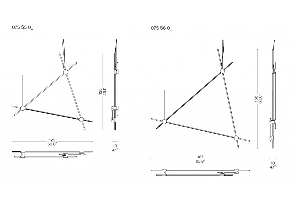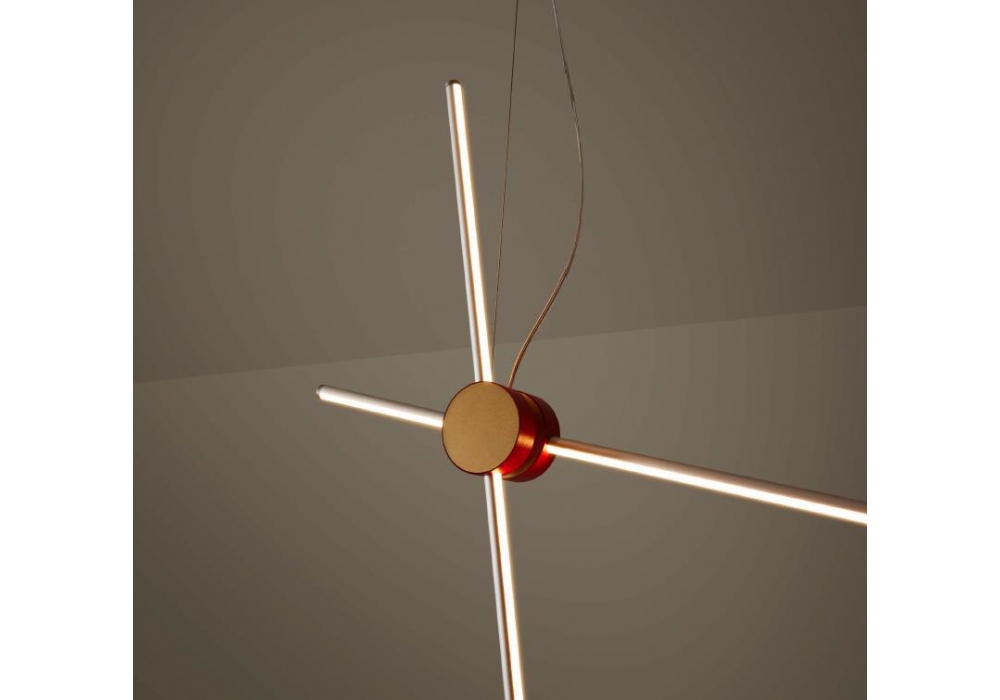 EITIE Triangle Vertical von Tobia Scarpa für Cassina entworfen, ist eine Hängeleuchte aus Aluminium und PC mit lackierten Metallgelenken in verschiedenen Ausführungen. Bestehend aus drei LED-Streifen.