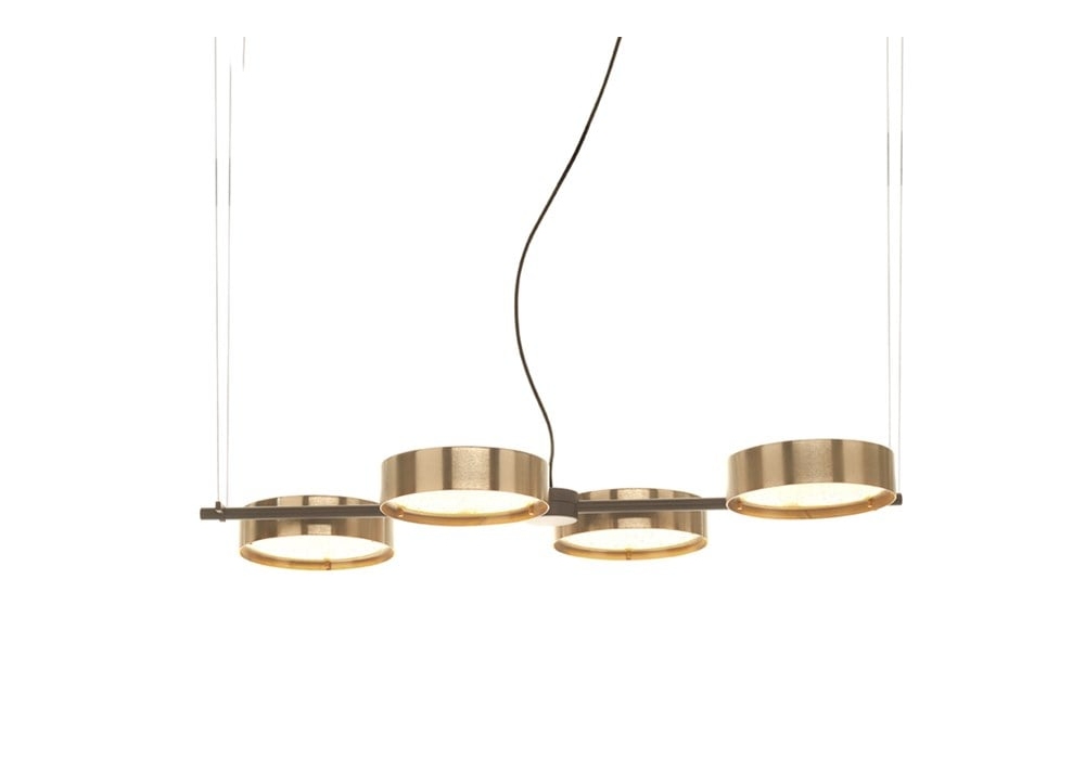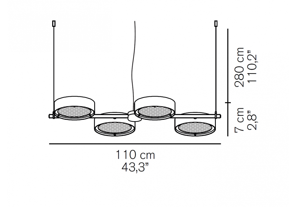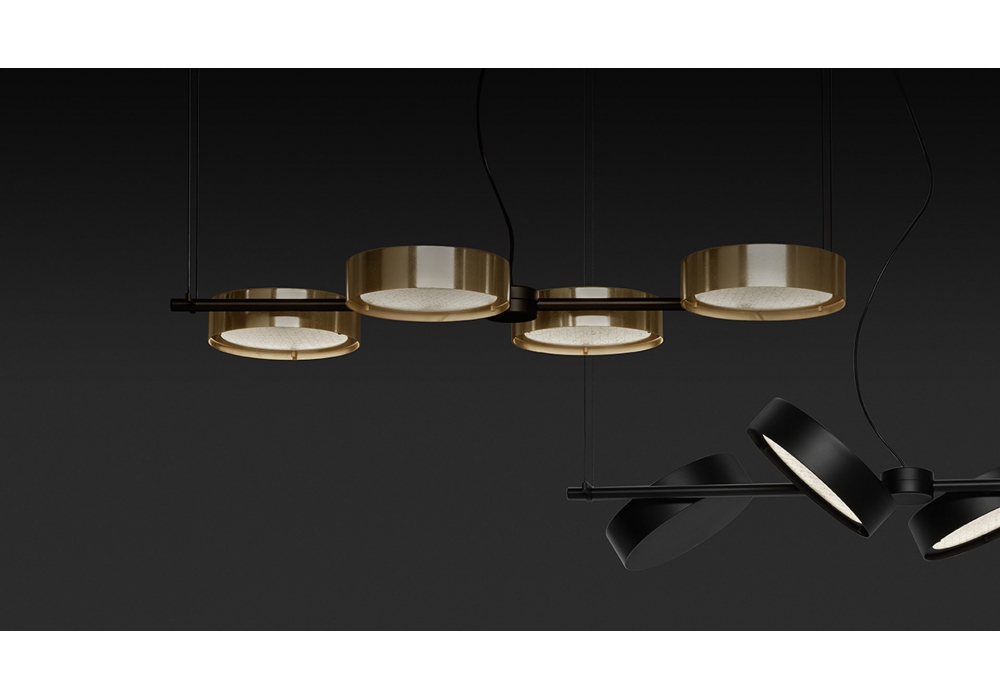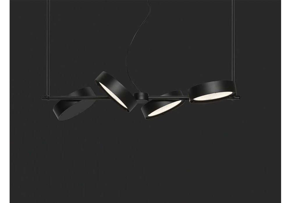 Berlin von Christophe Pillet für Oluce entworfen, ist eine Hängeleuchte mit tragender Struktur aus mattschwarz lackiertem Metallrohr. Die Diffusoren haben eine runde Form aus lackiertem Metall mit verdrahtetem und sandgestrahltem Glas und verfügen über eine dimmbare LED-Lichtquelle. Berlin ist in verschiedenen Ausführungen erhältlich.