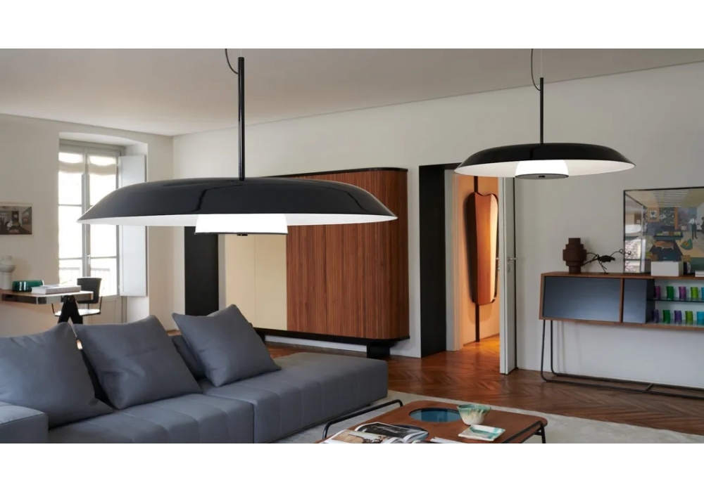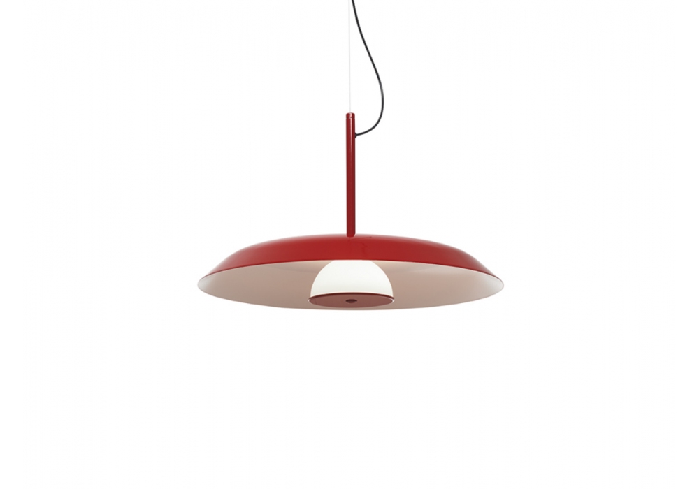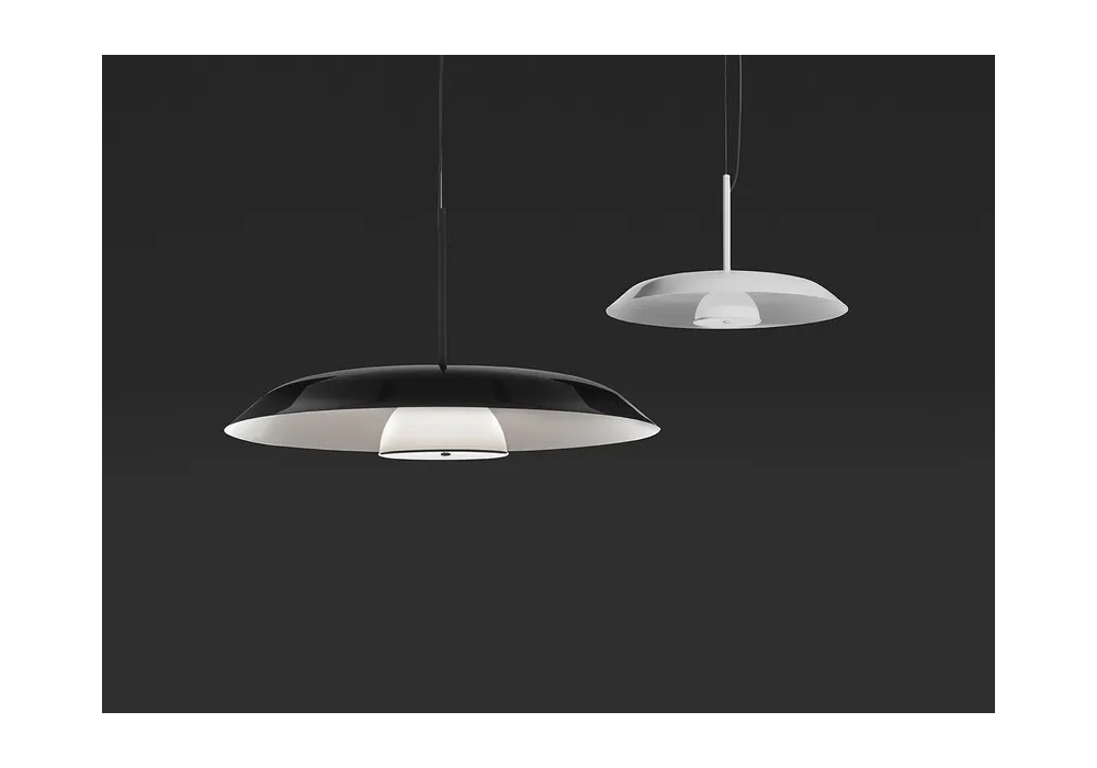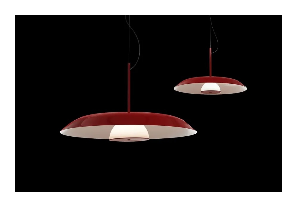 Iride von Bellucci Mazzoni Progetti für Oluce entworfen ist eine Hängeleuchte mit tragender Struktur und reflektierender Scheibe aus lackiertem Metall. Das zentrale Element aus säuregeätztem, mundgeblasenem Opalglas beherbergt eine LED-Lichtquelle. Iride ist in verschiedenen Ausführungen und Modellen erhältlich.