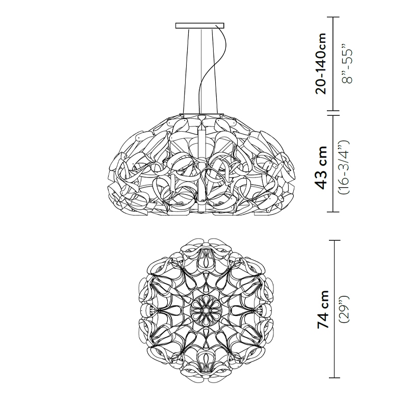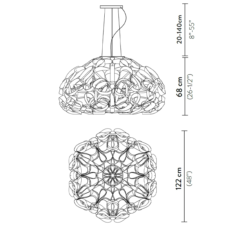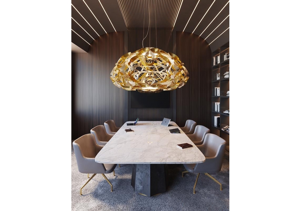 Quantica entworfen von Adriano Rachele für Slamp ist eine Hängeleuchte mit abgerundeter Form die durch mehrere Bandelemente aus goldfarbenem Opalflex® strukturiert wird. Bei den verwendeten Lichtquellen handelt es sich um dimmbare Glühfaden-LEDs. Quantica ist in verschiedenen Modellen erhältlich.