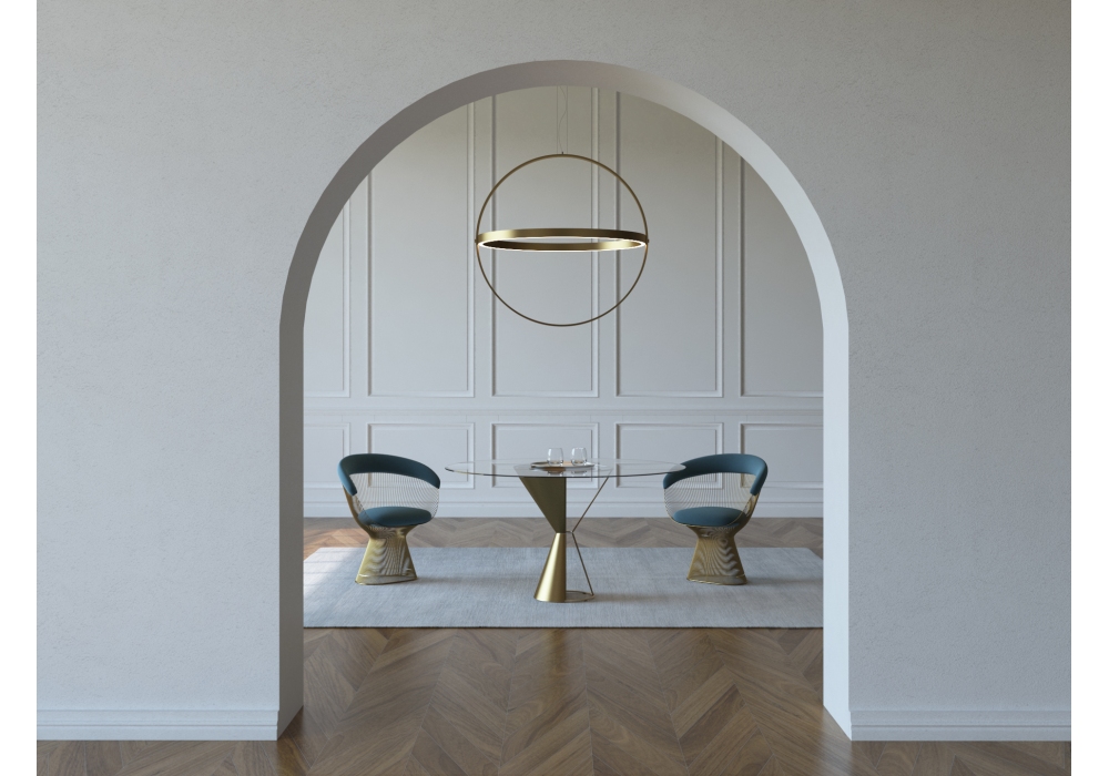 Saturn von Serra By Milia für Escooh entworfen, ist eine Hängeleuchte aus Massivholz oder Metall. Stufenlos gebogene, dimmbare LED und Transformator im Deckenbaldachin integriert. Die Höhe variiert je nach gewähltem Durchmesser.