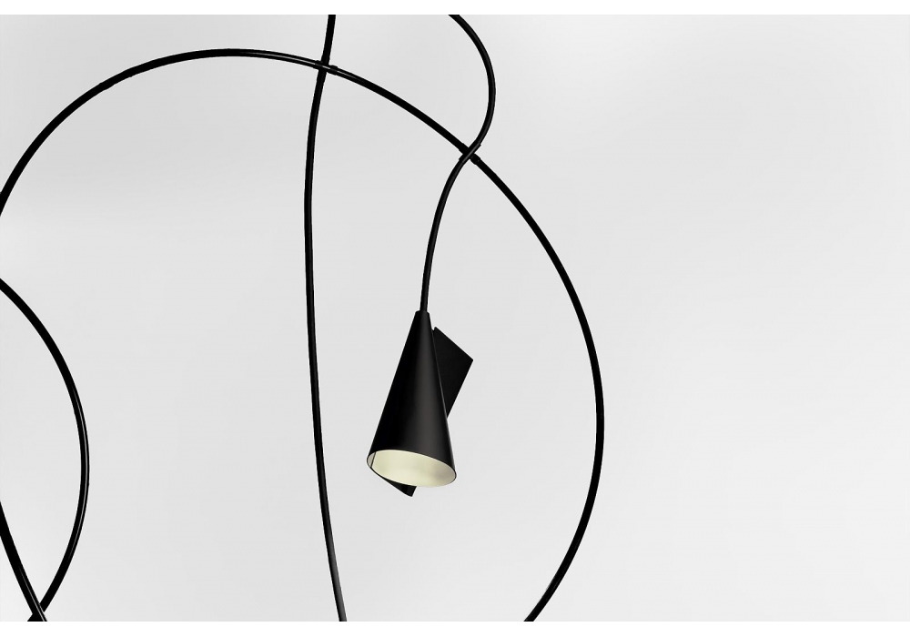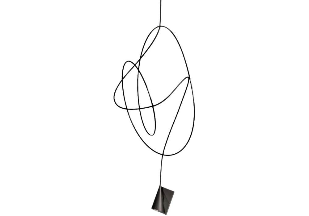 Signature, entworfen und hergestellt von Ingo Maurer, ist eine Hängeleuchte, die aus einem weichen schwarzen Kabel besteht, das sich in der Luft bewegt und sich in sanfte Kurven und Kreise biegt, um mit kleinen Clips an der elastischen kreisförmigen Struktur, ebenfalls in Schwarz, befestigt zu werden. Der Lampenschirm aus eloxiertem Aluminium ist mit einem Licht ausgestattet, das nach oben oder unten positioniert werden kann.