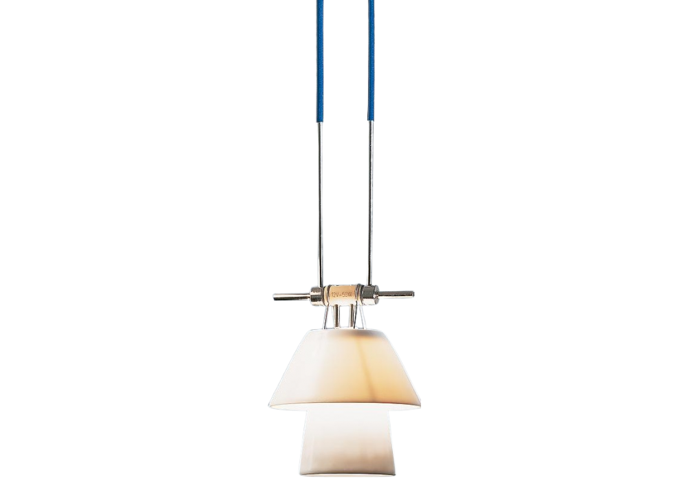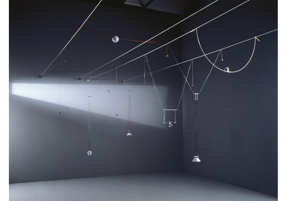 Yayaho Element 5, entworfen und hergestellt von Ingo Maurer, ist eine Hängeleuchte mit Struktur aus Metall und Kunststoff und Porzellanschirm. Horizontal und vertikal entlang der Kabel fahrbar. Es kann mit anderen Yayaho-Elementen kombiniert werden, um ein größeres Beleuchtungssystem zu schaffen.