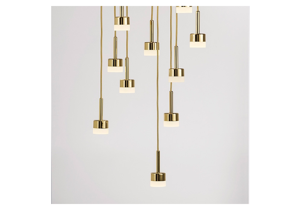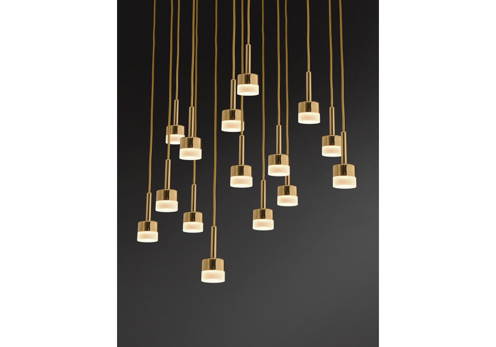 City Lights von Rakumba entworfen, ist eine Hängeleuchte, die in poliertem Messing, eloxiertem Aluminium oder pulverbeschichtet in verschiedenen Ausführungen erhältlich ist.