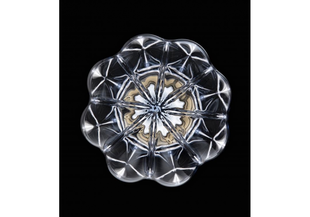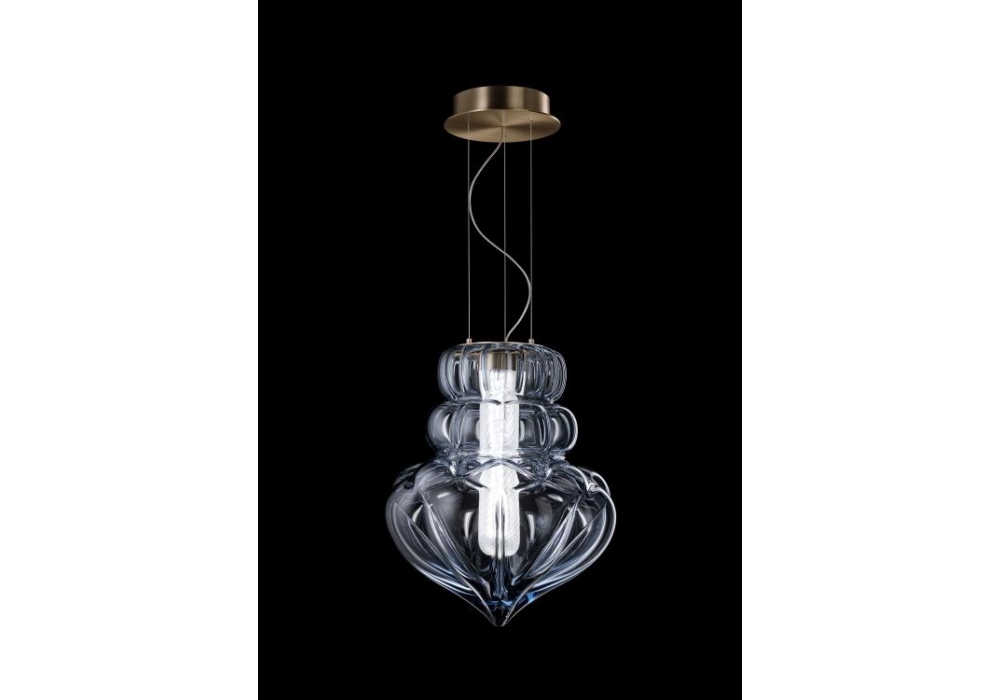 Vallonné von Luca Nichetto für Barovier & Toso entworfen ist eine Hängeleuchte mit Tragstruktur und Deckenbaldachin aus schwarzem Chrom oder honigbronzefarbenem Metall. Der Diffusor hat eine abgerundete Form aus transparentem venezianischem Glas und verfügt über eine dimmbare LED-Lichtquelle. Vallonné ist in verschiedenen Modellen und Ausführungen erhältlich.