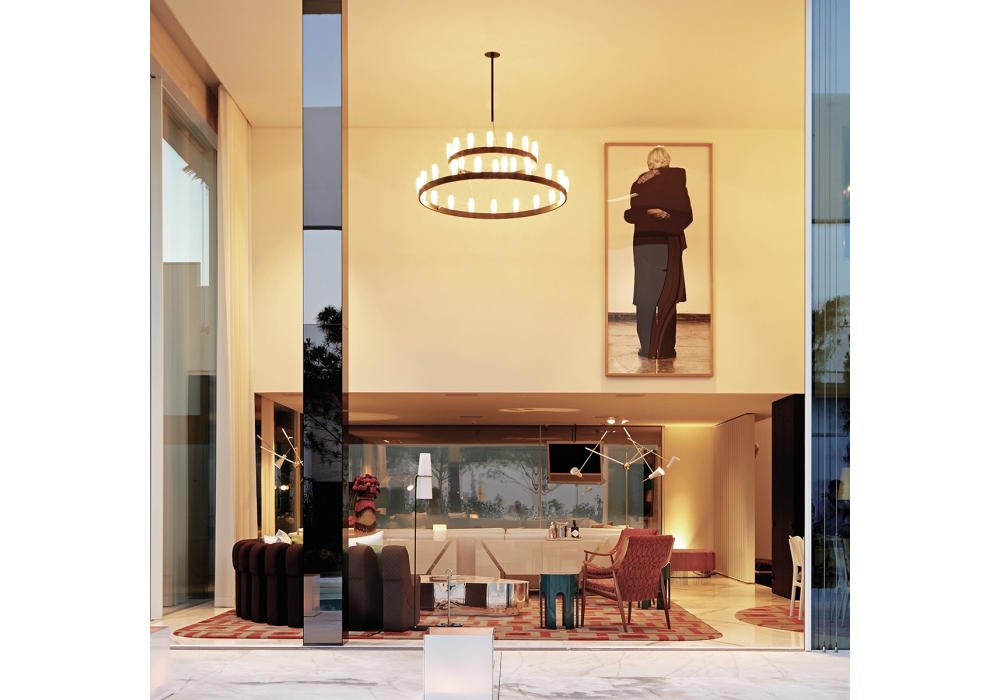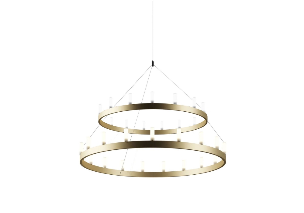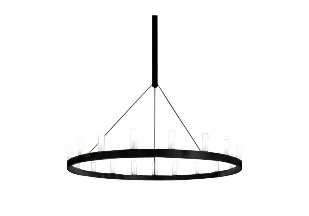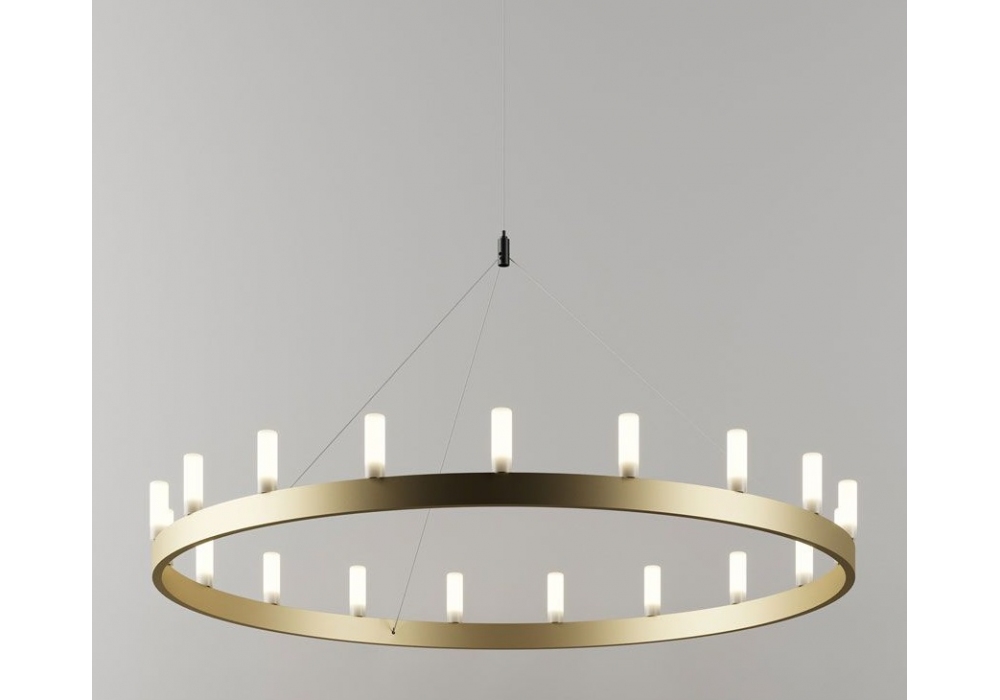 Chandelier, von David Chipperfield für Fontana Arte entworfen, ist eine dimmbare Hängeleuchte mit indirektem Licht mit runder Tragstruktur aus lackiertem Metall, Diffusoren aus sandgestrahltem Borosilikatglas. Aufhängungskabel aus Stahl und transparentes Stromkabel. Deckenrosette aus lackiertem Metall. Verfügbar in verschiedenen Abmessungen und Ausführungen.