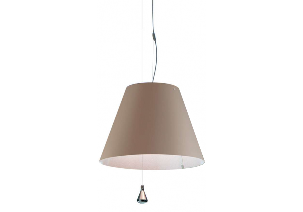 Costanza von Paolo Rizzatto für Luceplan entworfen, ist eine Hängeleuchte mit Gehäuse aus Aluminium und austauschbarem Lampenschirm aus siebgedrucktem Polycarbonat. Bei der Ausführung mit Riegel gibt es ein Gegengewicht aus matt verchromtem Stahl.