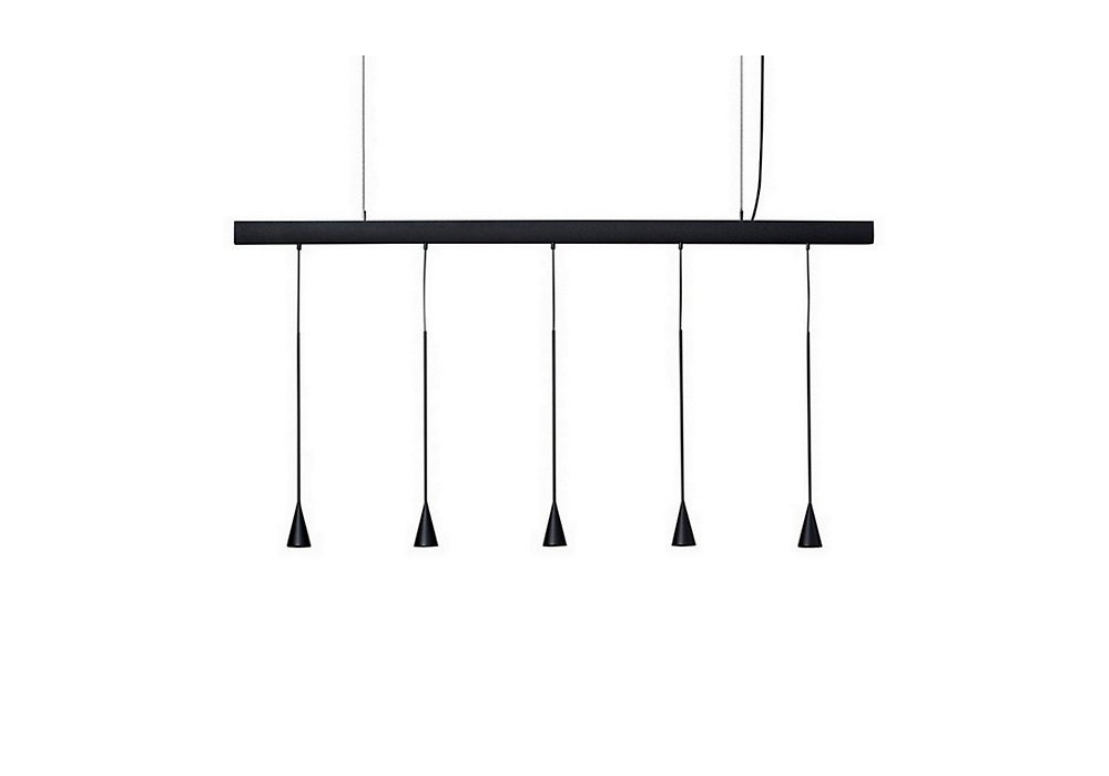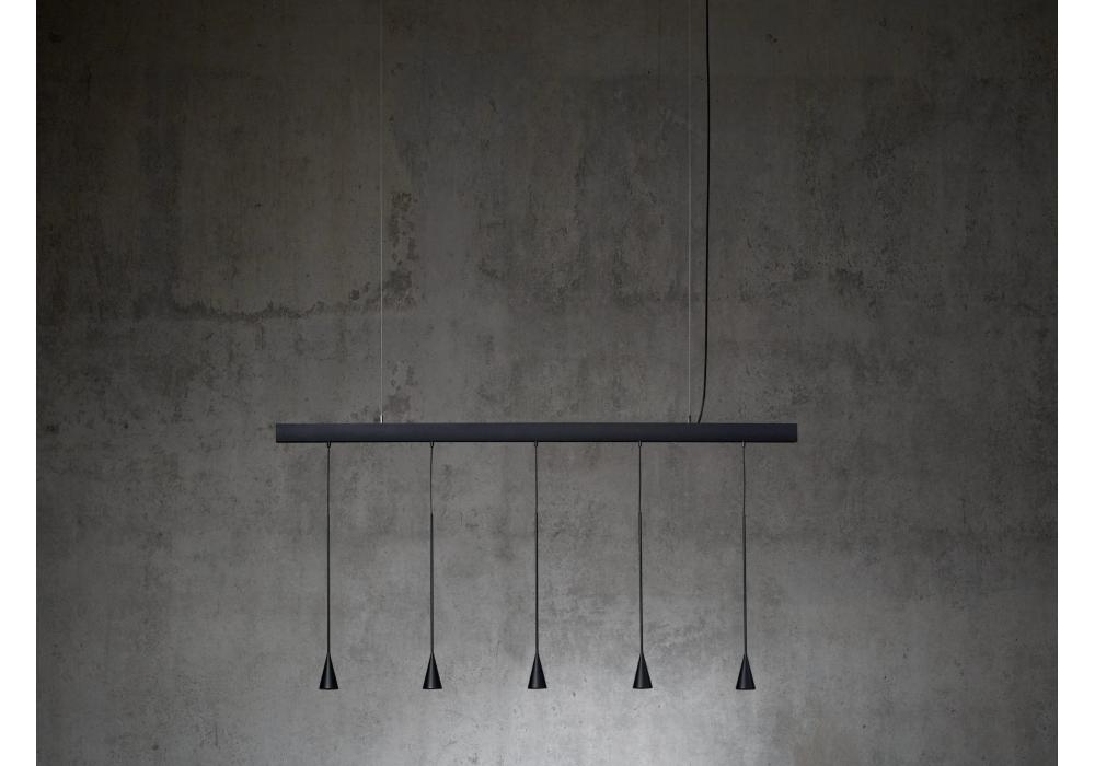 Skybell Linear von Estudi Manel Molina für Bover entworfen ist eine Hängeleuchte, die durch ein lineares Gestell aus Aluminium und Eisen in schwarzer Ebenholzfarbe strukturiert ist. Die Diffusoren haben eine konische Form aus schwarzem Ebenholzaluminium und schirmen eine dimmbare LED-Lichtquelle ab. Skybell Linear ist in verschiedenen Modellen erhältlich.