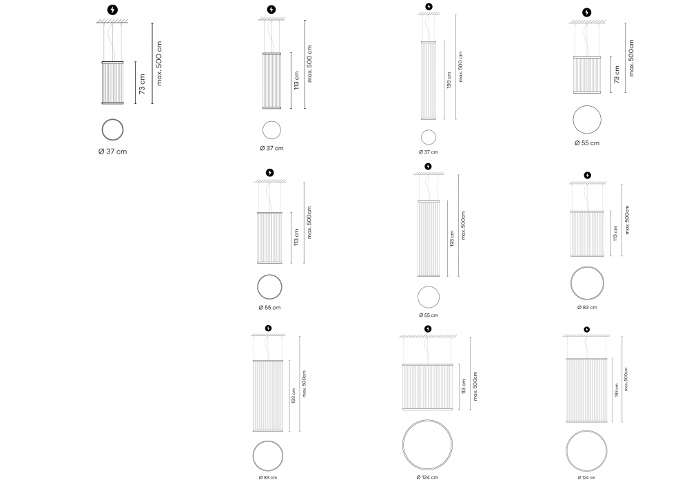 | Abmessungen | Ø 37 x H 73 cm; Ø 37 x H 113 cm; Ø 37 x H 193 cm; Ø 55 x H 73 cm; Ø 55 x H 113 cm; Ø 55 x H 193 cm; Ø 83 x H 113 cm; Ø 83 x H 193 cm; Ø 124 x H 113 cm; Ø 124 x H 193 cm. |