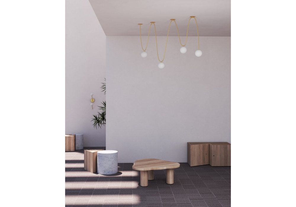 Motive von Atelier Areti entworfen, ist ein hängender Kronleuchter aus lackiertem Metall oder gebürstetem Messing und weißem Glasdiffusor. In verschiedenen Ausführungen erhältlich.