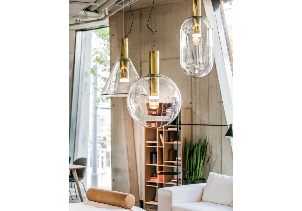 Phenomena Small Ball von Dechem Studio für Bomma entworfen, ist eine Hängeleuchte mit mundgeblasenem Kristalllampenschirm und Metalldiffusor. Es ist in verschiedenen Ausführungen erhältlich.