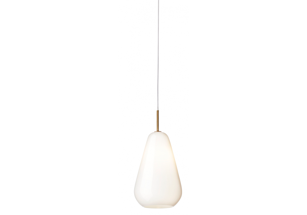 Anoli von Sofie Refer für Nuura entworfen, ist eine Hängeleuchte mit Opal- oder Golddiffusor aus geblasenem Glas. Die Ausführung des Kabels variiert je nach gewähltem Lautsprecher; Schwarz für den goldenen Diffusor und Weiß für den Opal.