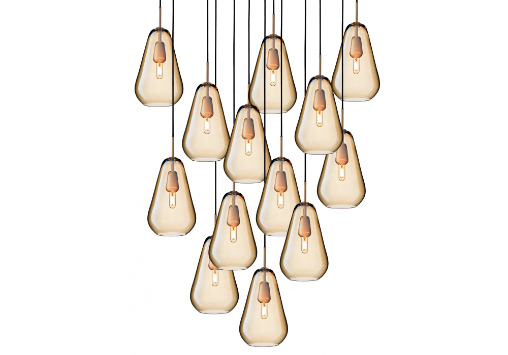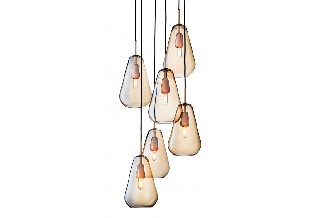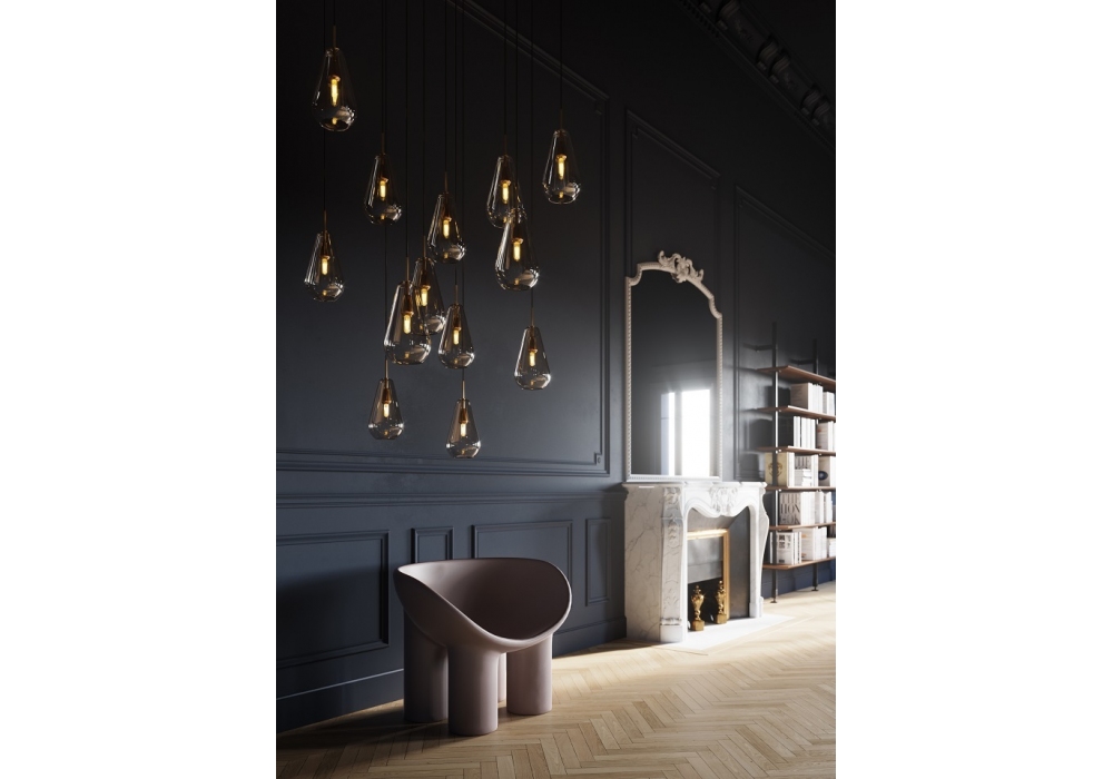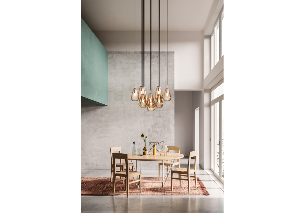 Anoli von Sofie Refer für Nuura entworfen, ist ein Leuchter mit Diffusoren aus geblasenem Opal- oder Goldglas. Die Ausführung des Kabels variiert je nach den gewählten Lautsprechern; Schwarz für die goldenen Diffusoren und Weiß für die Opaldiffusoren.