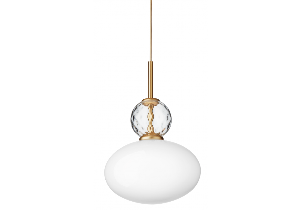 Rizzatto von Paolo Rizzatto für Nuura entworfen, ist eine Hängeleuchte mit Lampenschirm aus mundgeblasenem Opalglas und satinierten Metallringen. Zwischen Stab und Metallring befindet sich eine transparente Glaskugel.