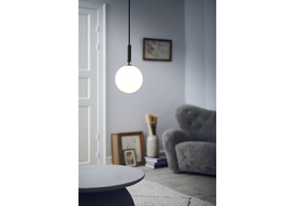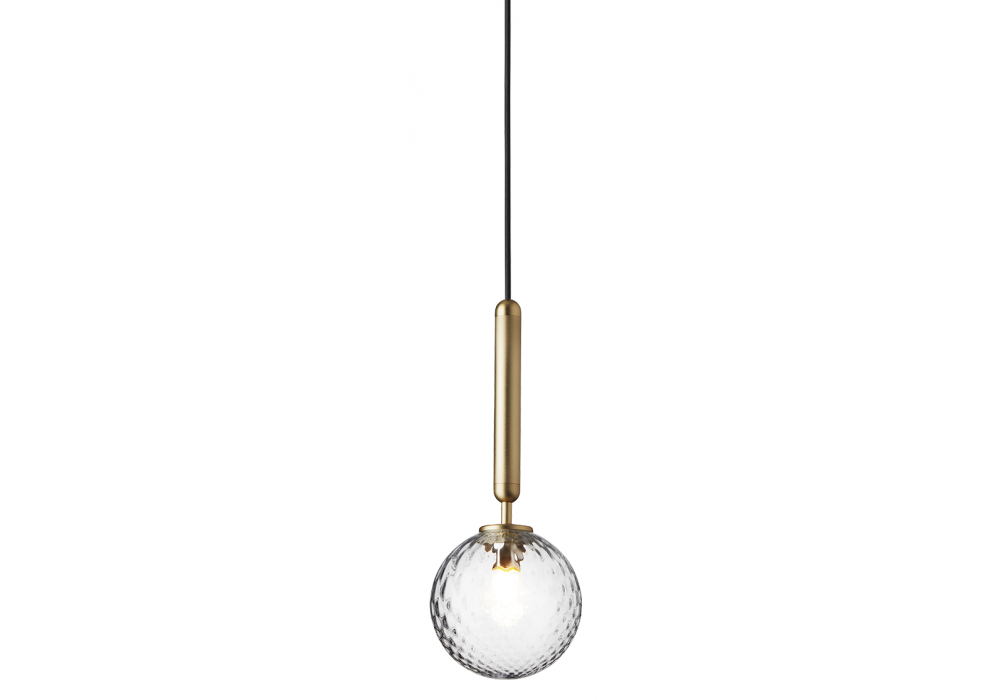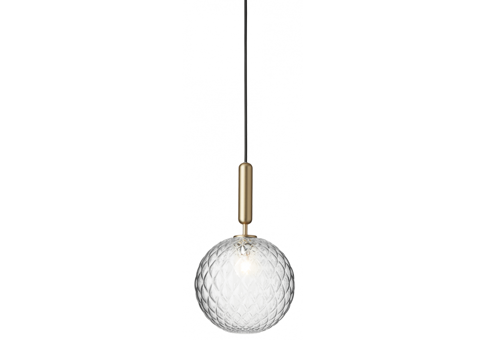 Miira diseñada por Sofie Refer para Nuura es una lámpara de suspensión con estructura de metal trabajado y difusor de vidrio opalino soplado o transparente con dibujo en relieve.