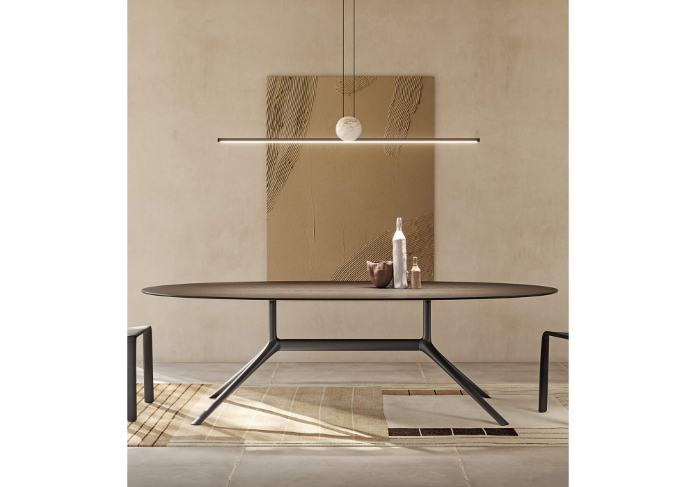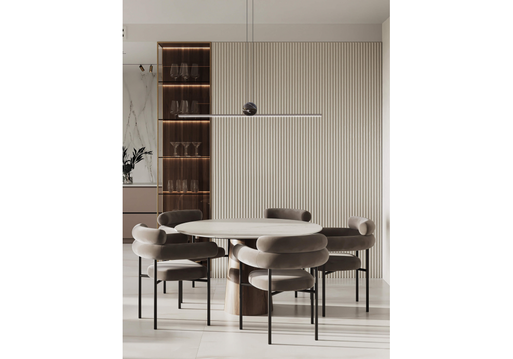 Regolo von Stefano Traverso für Italamp entworfen, ist eine Hängeleuchte mit Metalldiffusorprofil in Mattschwarz oder Mattchampagner. Dekorative Kugel aus goldenem Calacatta- oder Marquina-Marmor. Diffusor aus opalem Methacrylat