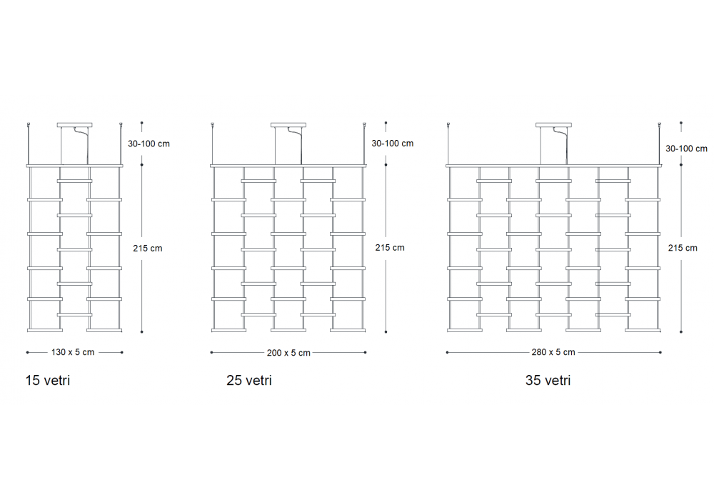 | Abmessungen | 130 x 5 x H 215 + 30-100 cm; 200 x 5 x H 215 + 30-100 cm; 280 x 5 x H 215 + 30-100 cm. |