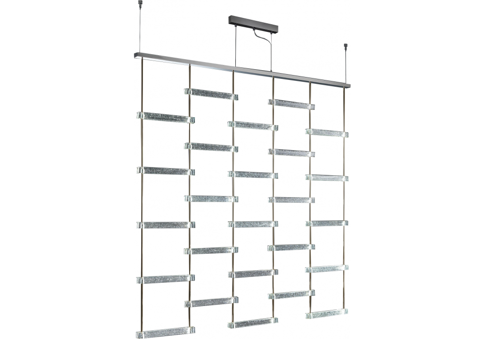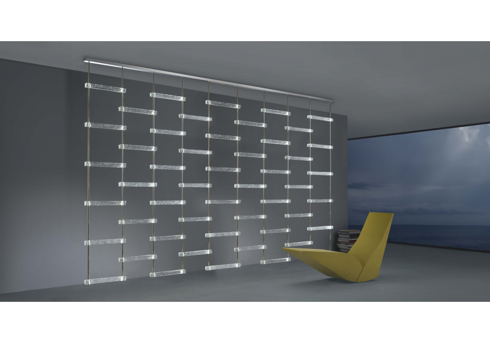 Piola von Danilo De Rossi für Italamp entworfen, ist eine modulare Hängeleuchte, die aus farbigen Glasstäben mit internen LED-beleuchteten Mikroblasen besteht. Metallstruktur in hellem Gold und poliertem Chrom.