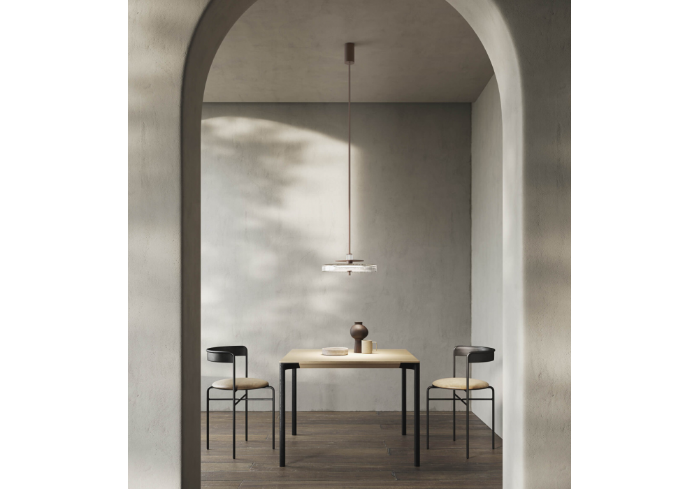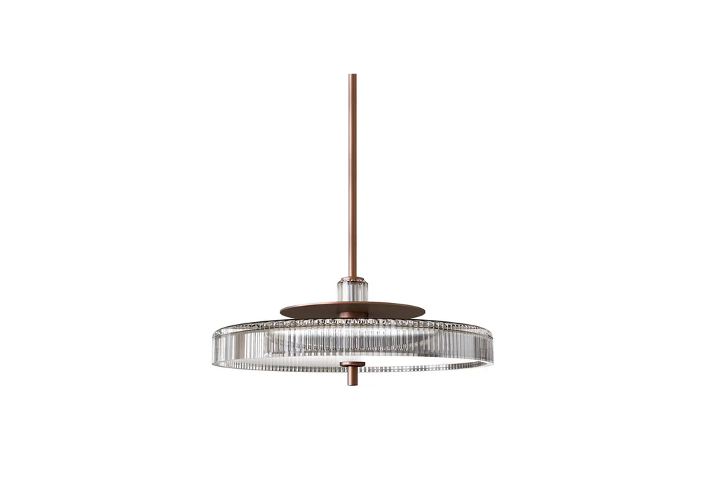 Gilda von Roberta Vitadello für Italamp entworfen, ist eine Hängeleuchte mit handgeschnitztem Kristalldiffusor und Metallstruktur aus satiniertem Corten oder mattem Champagner.