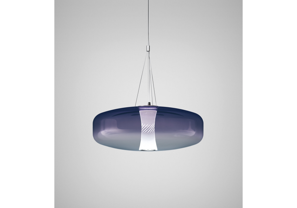 Solene von Danilo De Rossi für Italamp entworfen, ist eine Hängeleuchte mit äußerem Diffusor aus mundgeblasenem Glas mit einem schattierten Blau-Lila- oder schattierten Gold-Metallic-Finish und innerem Diffusor aus weißem mundgeblasenem Glas mit handgeschnitzten Schnitzereien. Struktur aus metallfarbenem Metall.