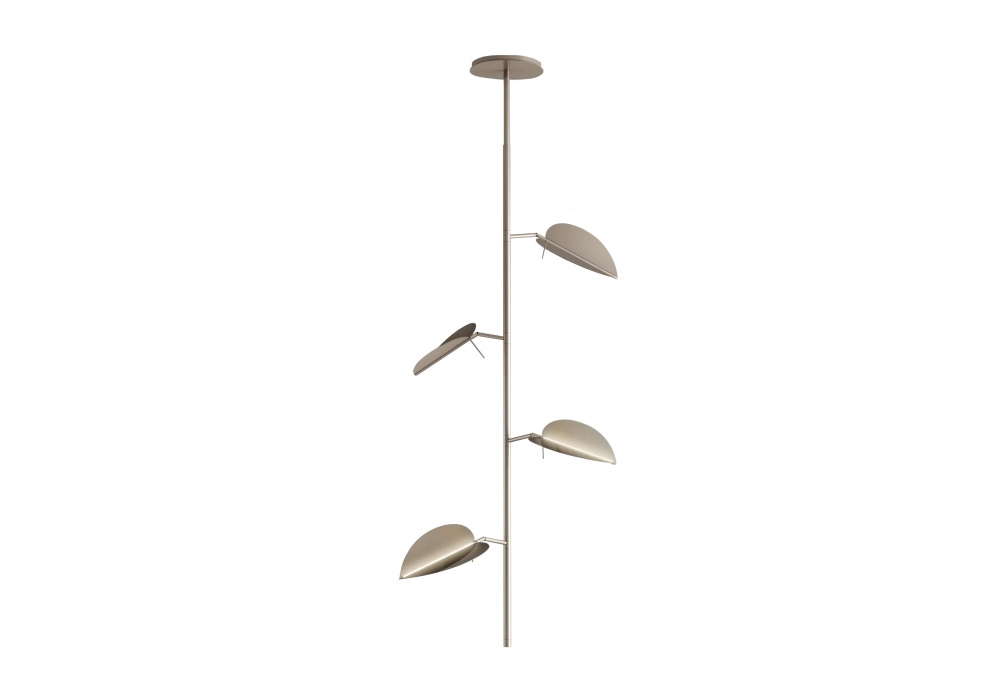 Aracea von Gupica für Visionnaire entworfen ist eine Hängeleuchte mit kreisförmiger Rosette und vertikalem Stab aus lackiertem Stahl. Die Diffusoren sind blattförmig und können sowohl gedreht als auch geneigt werden, um das Licht nach Wunsch zu streuen. Im mittleren Teil jedes Blattes befindet sich eine hocheffiziente lineare LED-Lichtquelle. Aracea ist in verschiedenen Ausführungen erhältlich.