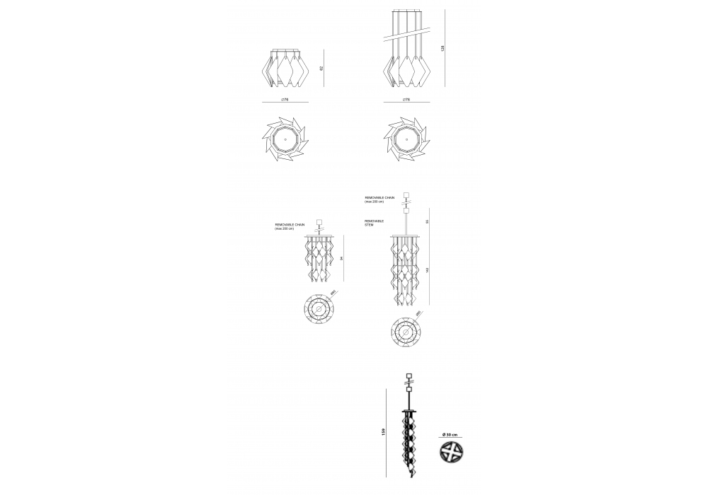 | Abmessungen | Ø 76 x H 62 cm; Ø 76 x H 128 cm; Ø 60 x H 197 cm; Ø 60 x H 94 cm; Ø 30 x H 159 cm. |
