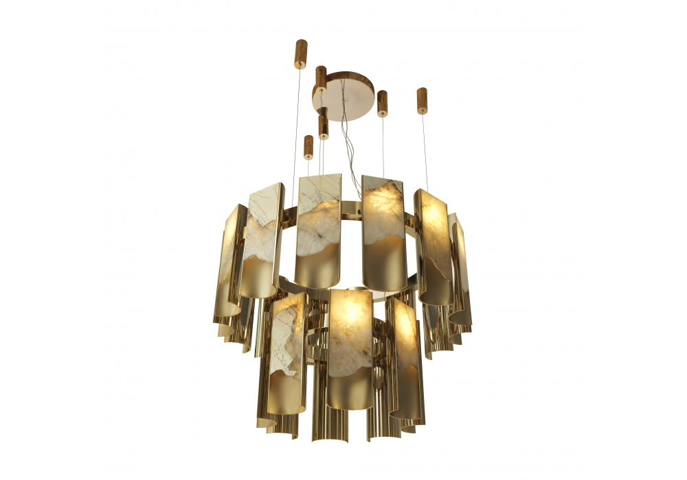 Polaris von Alessandro La Spada für Visionnaire entworfen ist ein kreisförmiger Leuchter der aus mehreren gebogenen Elementen besteht, die außen aus poliertem Aluminium und innen aus satiniertem Aluminium bestehen. Die Diffusoren haben eine hinterleuchtete Maserung und das verwendete Beleuchtungssystem ist vom Typ COB-LED. Der Innenrahmen besteht aus Metallringen, die von Stahlseilen getragen werden. Polaris ist in verschiedenen Modellen und Ausführungen erhältlich.